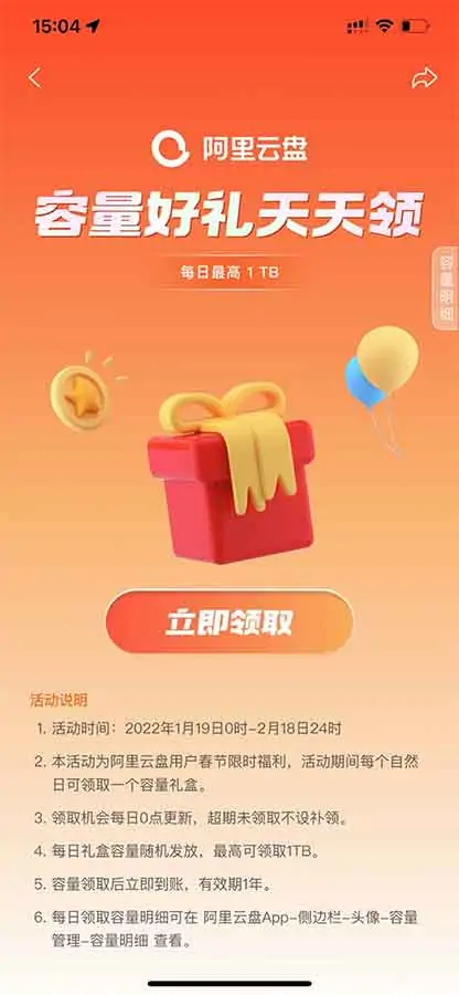 4. 每日礼盒容量随机发放,最高可领取1TB。
