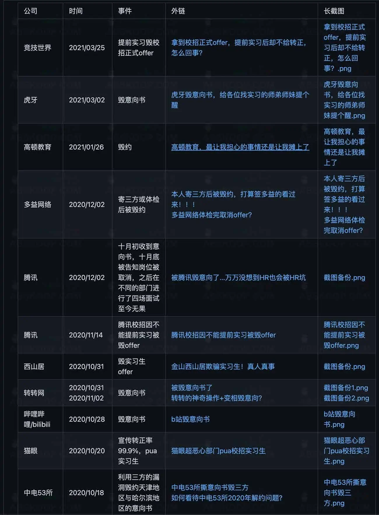 校招污点公司记录,收集校招污点公司或组织,帮助学弟学妹避雷。互联网不曾遗忘!