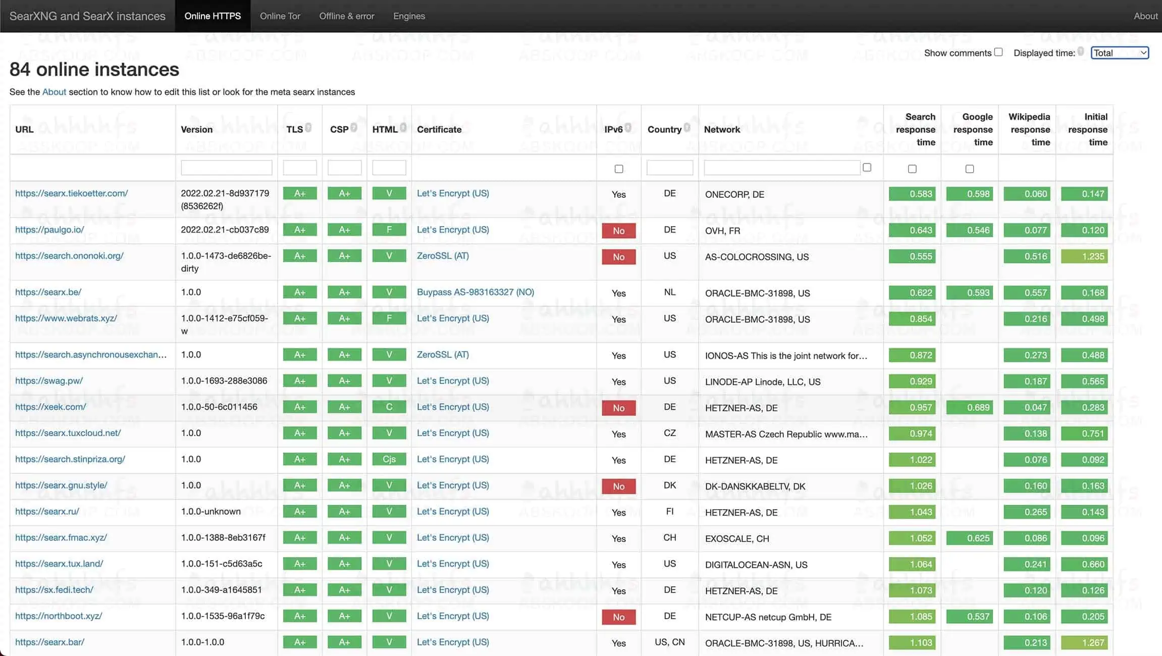 此外还有一个发布页,网站显示了 SearXNG(和 searx)公共实例。每 24 小时更新一次,响应时间每 3 小时更新一次,可以挑选一个速度好的用。
