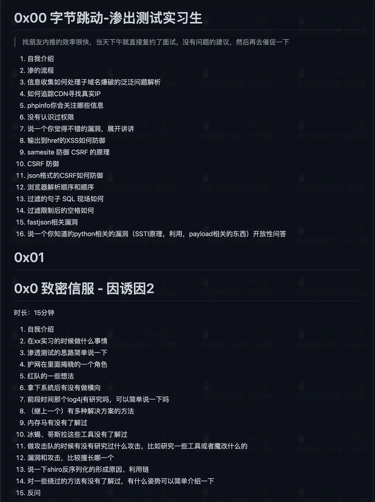 - 个人强大的面试官而个人,因为不同的项目经历,感觉面试官会讲给你介绍的项目,但不能亲自介绍一次真实的攻防/渗透/挖洞/CTF/CTF/CTF自己介绍一次真实的攻防/渗透/挖洞/CTF/CTF/的经历 => 所以对于自己的项目,面试前建议做一次复盘,最好能描述出细节,在面试的时候才不会遇到绊脚石,或者通知一些自己需要用意的细节