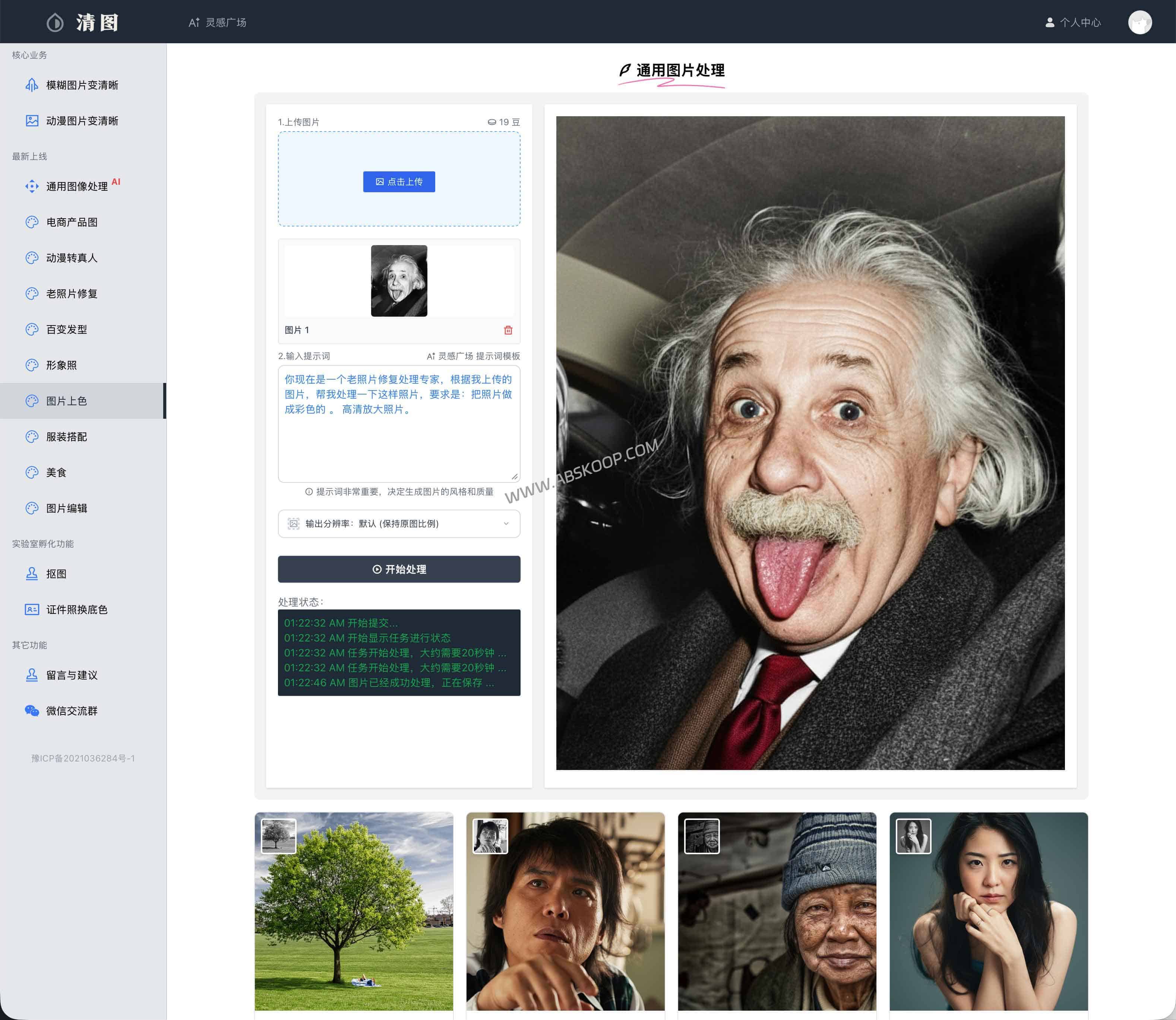 除了静态图像的清晰度提升,平台还整合了黑白照片智能着色。此外平台还有图片配音等附加功能,不过对大多数人来说,核心价值还是超分辨率放大和智能抠图这两项。