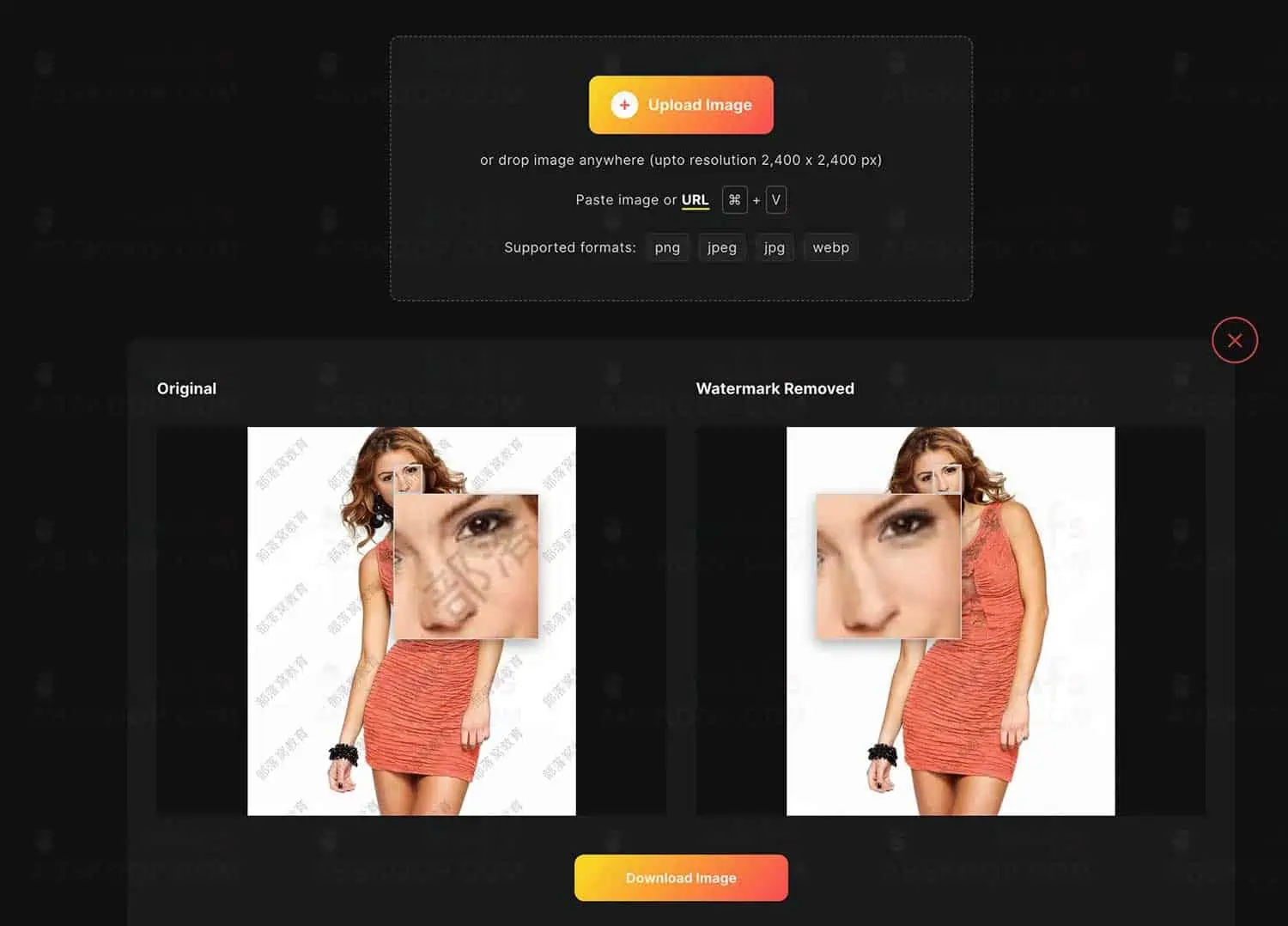 Removewatermarks是一个免费图片去水印工具,在线使用智能AI,对图片去水印,只需把图片上传或者把图片url贴上,后台即可实现在线智能ai图片去水印,好像还有专门的app,可以下载试试,不过我没有试过app,我一般在线图片去水印比较常用。