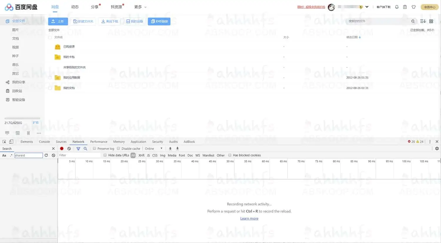 使用Chrome或类似浏览器访问百度网盘主页,完全载入后按F12调出控制台,选择网络(NetWork)选项卡,目前应该空空如也: