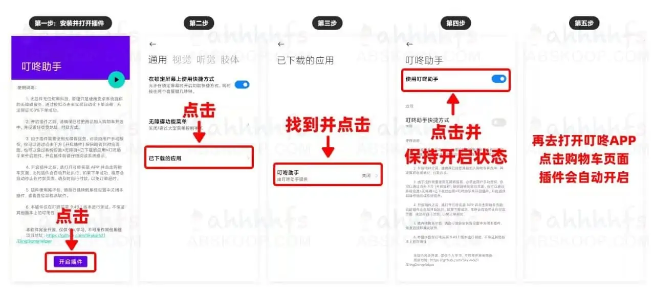 3. 开启插件需要用户手动授权,可以通过点击下方[开启插件]跳转到对应页面。或者通过系统设置>无障碍>已下载的应用>叮咚助手。开启插件前请仔细阅读系统捻示。