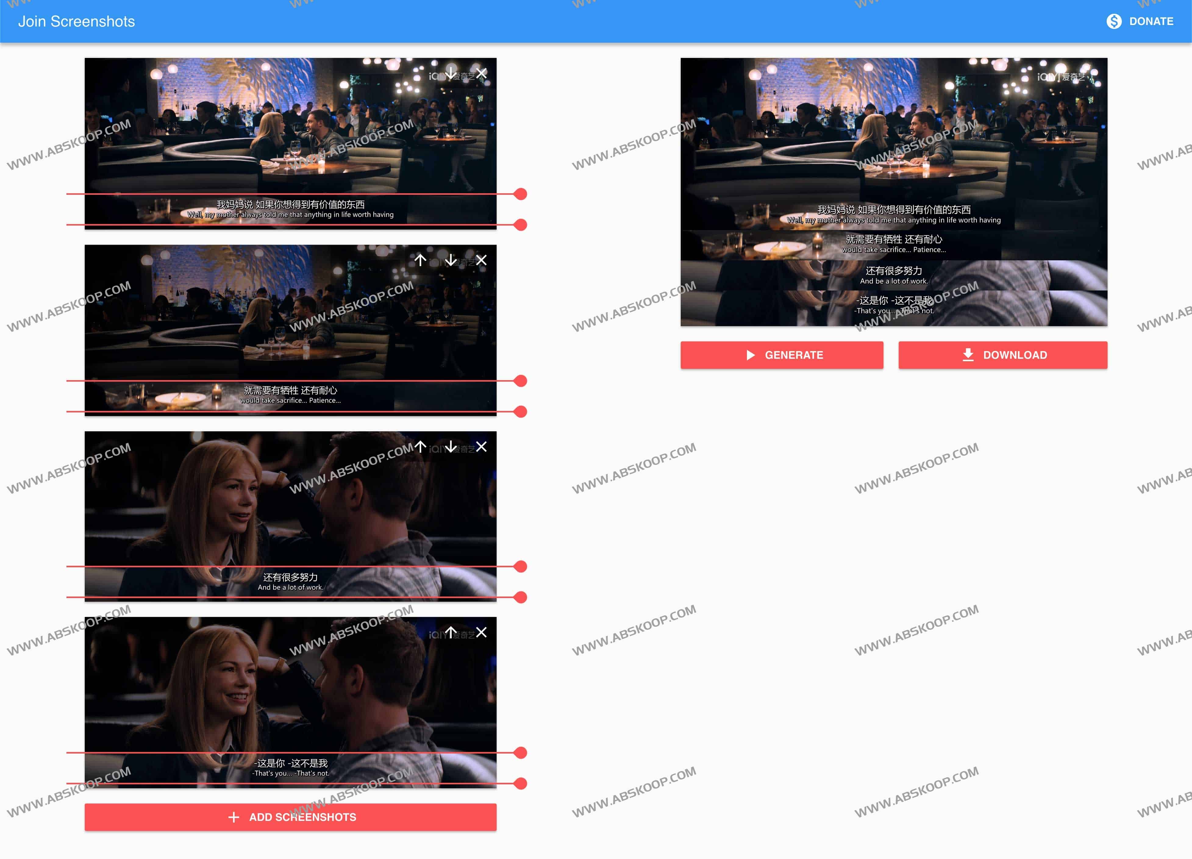 Join Screenshots是一款免费在线电影台词拼接工具,相信大家都在朋友圈、微博、等等地方看过这种有趣电影台词拼接图片,其实这类图片可以通过PS、美图秀秀等等软件编辑生成,这类软件应该挺多的,类似app什么的等等,找到一款在线生成的,不用安装什么解决一时之需,直接上传截图拖拽处理,免费无水印,很方便。