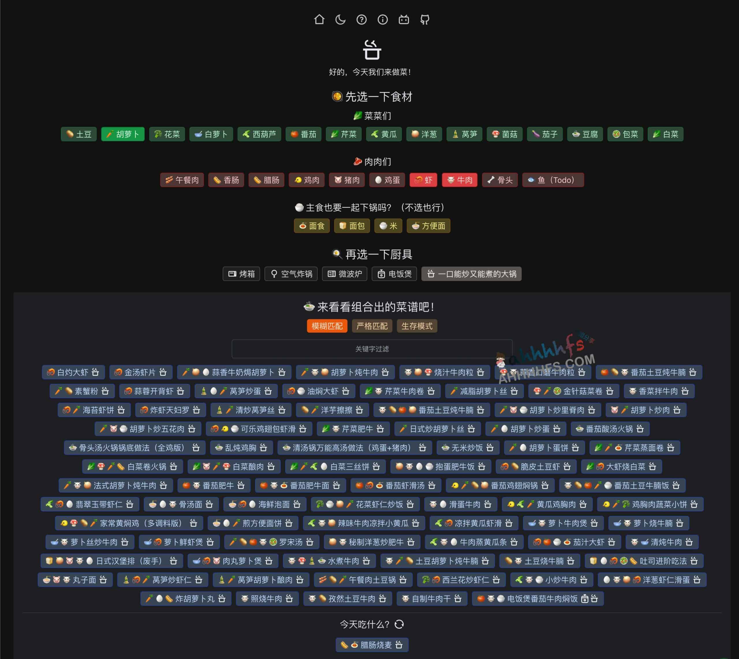 Cook(隔离食用手册)居家在线食谱是网友做的一个做菜小工具,打开网站就能看到常用的食材原材料和厨具,都是一些触手可及的原材料,对于居家或者周末想动手做饭饭吃的的厨房小白管用,想吃什么选好原材料,然后跳出相关的菜谱,挑一个点击就直达B站视频制作过程,比起你不知道做啥直接搜索视频提供更好的辅助选择,手把手教学,非常实用做菜小工具。