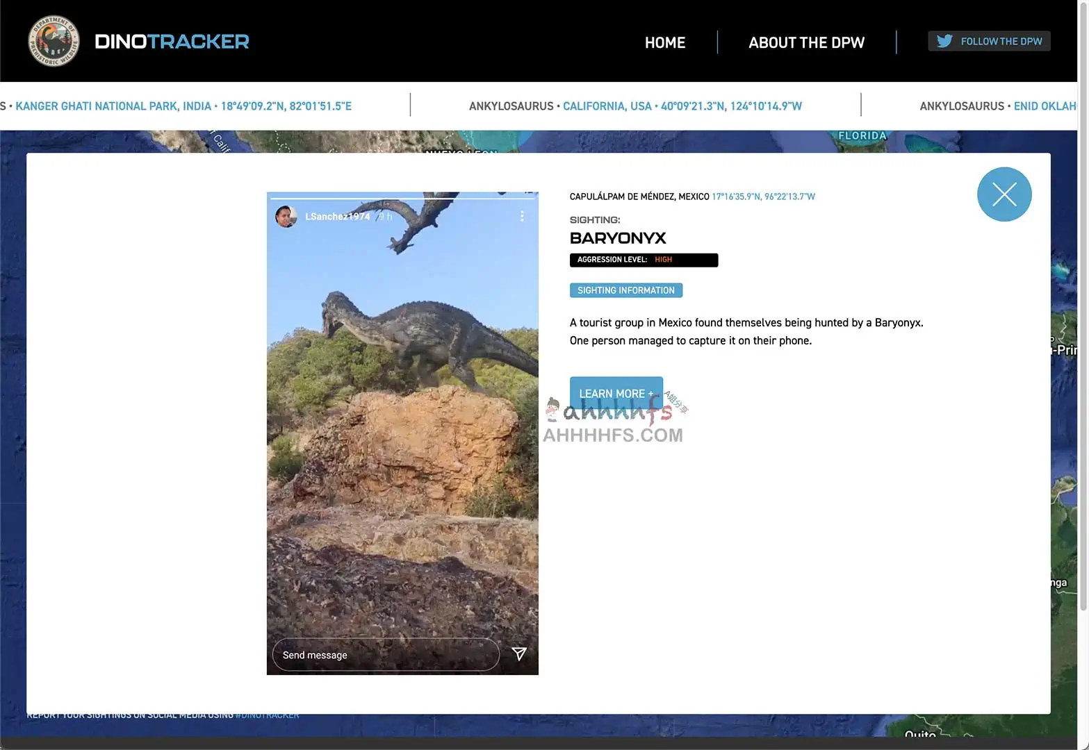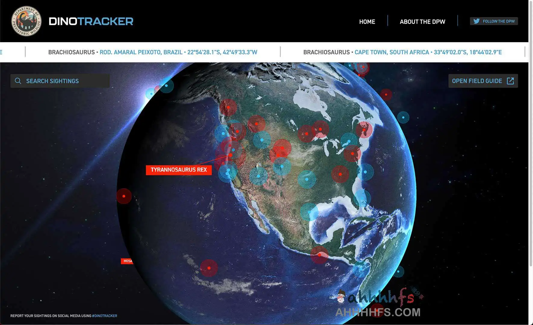 Jurassic World Dominion Dinotracker,恐龙追踪器,由环球影业创建的一个网站,主要是发布有关恐龙遭遇、用户提交的目击事件和重要信息的最新报告,以促进人类和恐龙在地球上的共存。网站支持搜索或者找地地图寻找,每个事件点都有图片或者视频和描述,还有该事件的发生地点经纬度等等,还有一些野外求生指南。