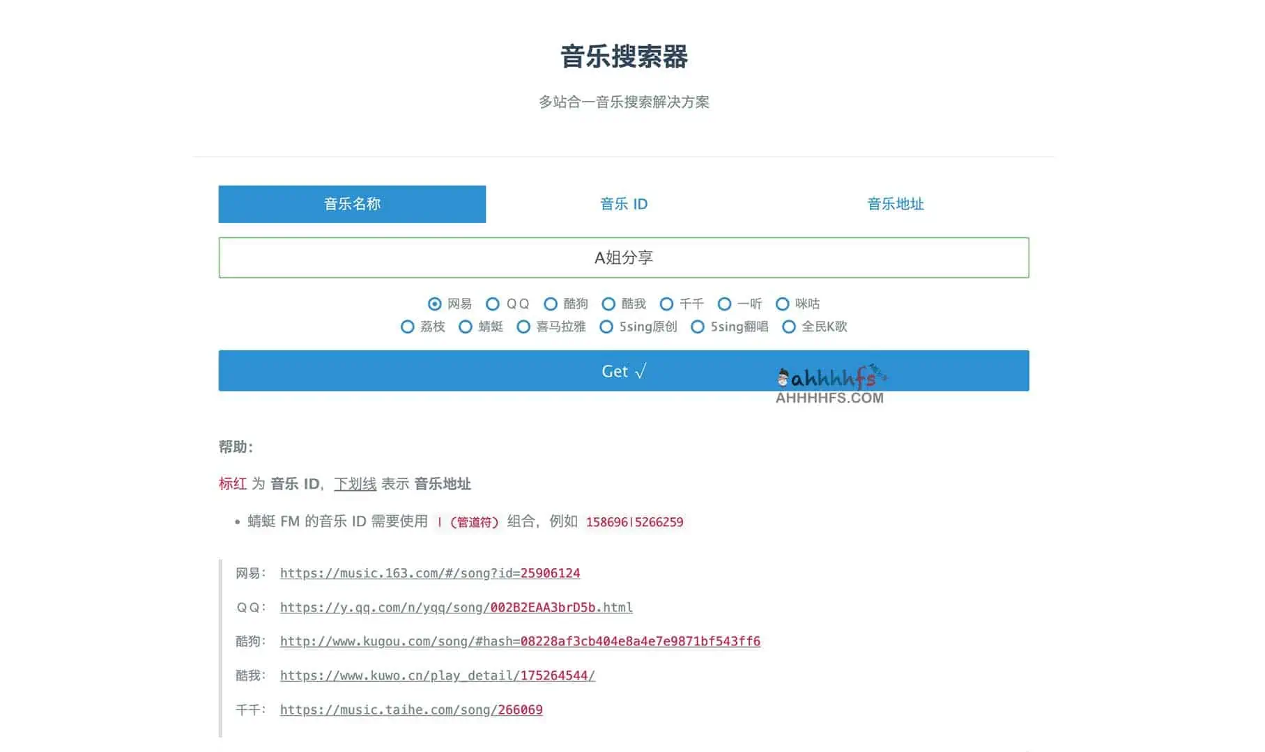 多站合一音乐搜索器,由麦葱特制多站合一音乐搜索解决方案,可搜索试听网易云音乐、QQ音乐、酷狗音乐、酷我音乐、虾米音乐、百度音乐、一听音乐、咪咕音乐、荔枝FM、蜻蜓FM、喜马拉雅FM、全民K歌、5sing原创翻唱音乐,搜索支持音乐名称、音乐ID和音乐链接,也可以对音乐和音乐歌词进行下载,人多的时候好像需要验证码。