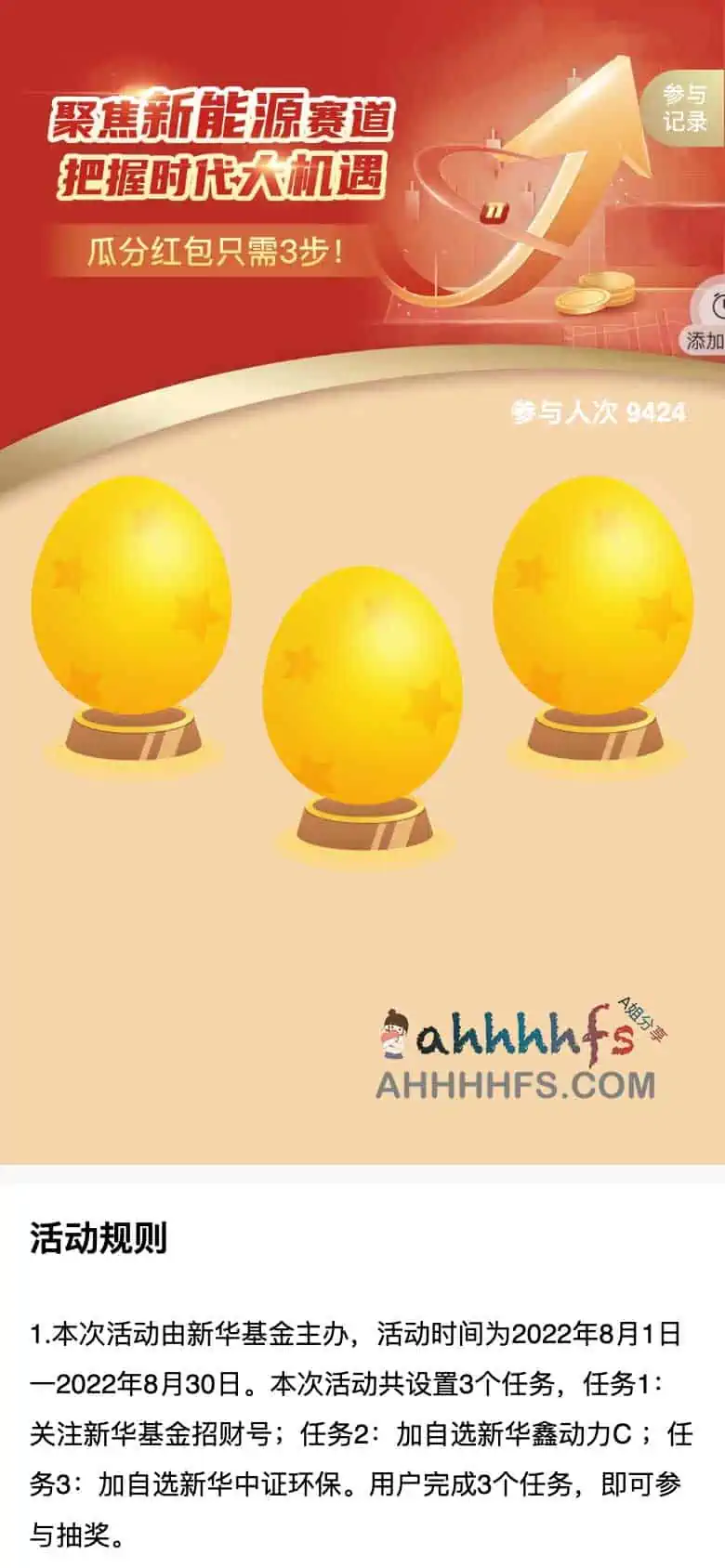 1.本次活动由新华基鍂主办,活动时间为2022年8月1日—2022年8月30日。本次活动共设置3个任务,任务1:关注新华基金招财号;任务2:加自选新华鑫动力C;任务3:加自选新华中证环保。用户完成3个任务,即可参与抽奖。