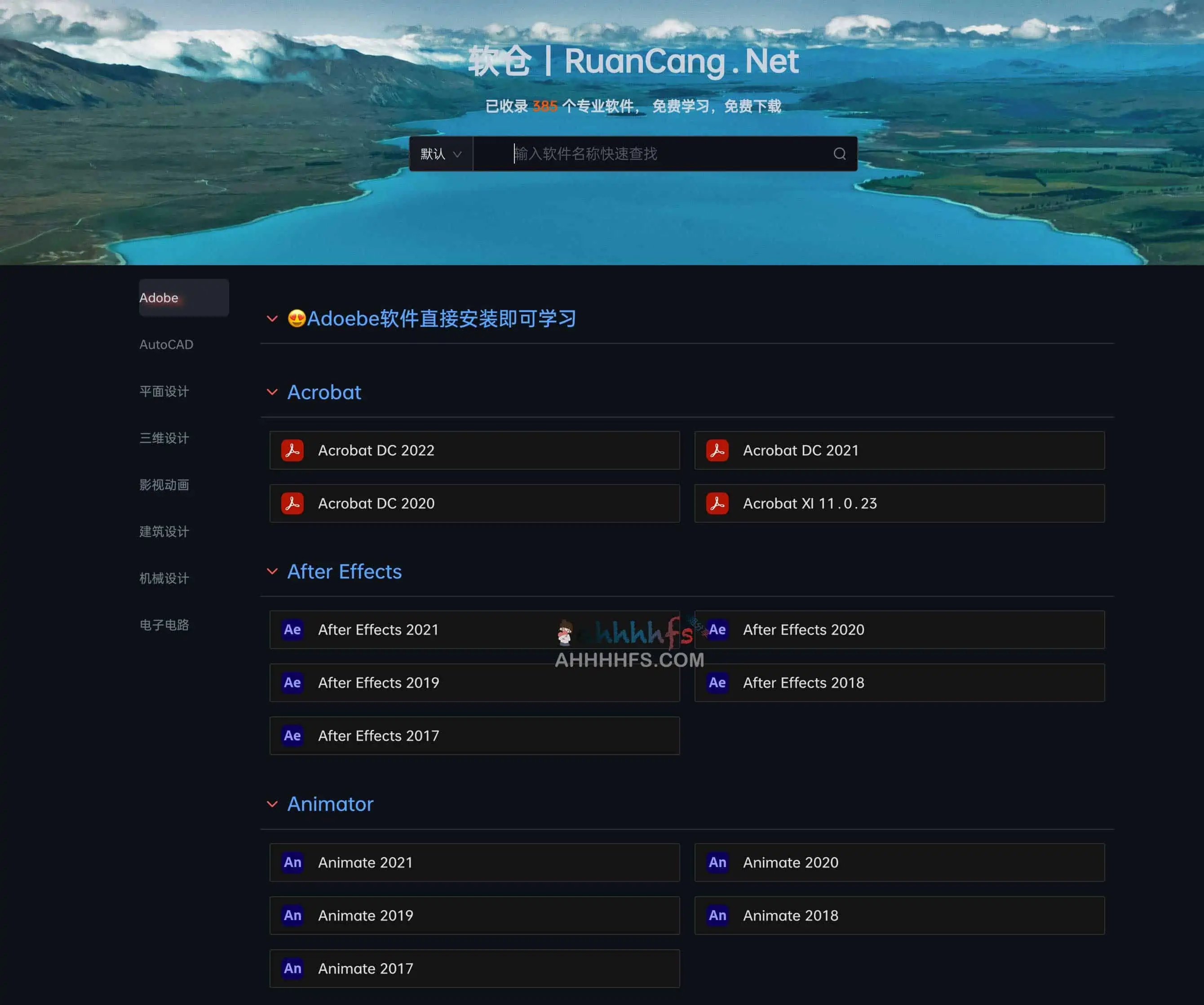 软仓是一个集合专业软件的导航网站,目前收录385 个专业软件免费下载、供学习使用,主要是设计类的软件,包括Adobe全家桶、AutoCAD、平面设计站、三维设计、动画影视、建筑机械设计和电子电路等等,站内承诺无毒无广告,纯公益项目,不以此盈利,且用且珍惜。