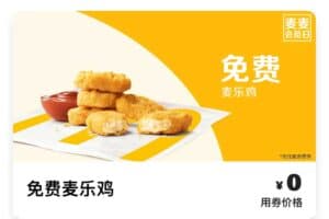 麦当劳周一免费麦乐鸡,到店专享,凭券任意消费可用,通过到店取餐功能进行任意消费下单时,凭本券可免费换取1份麦乐鸡块,A姐提醒,建议麦当劳忠实用户领取,为了用这个券去消费就被套路了哈。