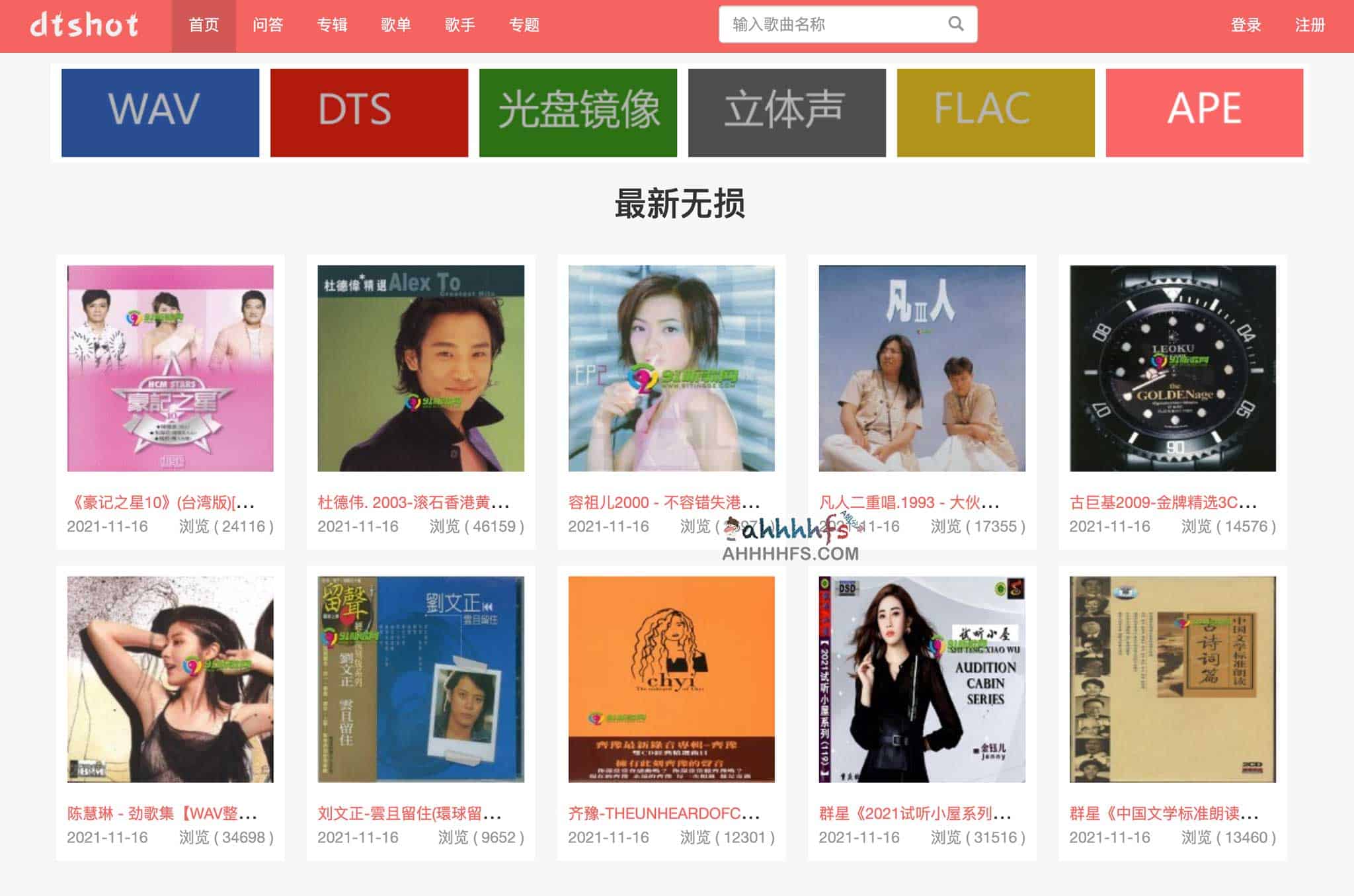无损音乐吧- dtshot,一个在线无损音乐免费下载网站,免费提供各种无损格式的流行音乐下载,网站定期收集更新最新最全flac、ape、wav、dsd、dts等格式的无损音乐下载,网站的无损音乐是通过网盘分享下载的,不过下载无损音乐需要注册网站账号,是免费的,不想使用个人信息可以使用临时邮箱即可。