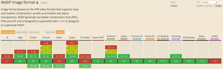 截止到2020年的浏览器支持状态如下所示,可以看出现在主流的浏览器都已经支持这种格式。