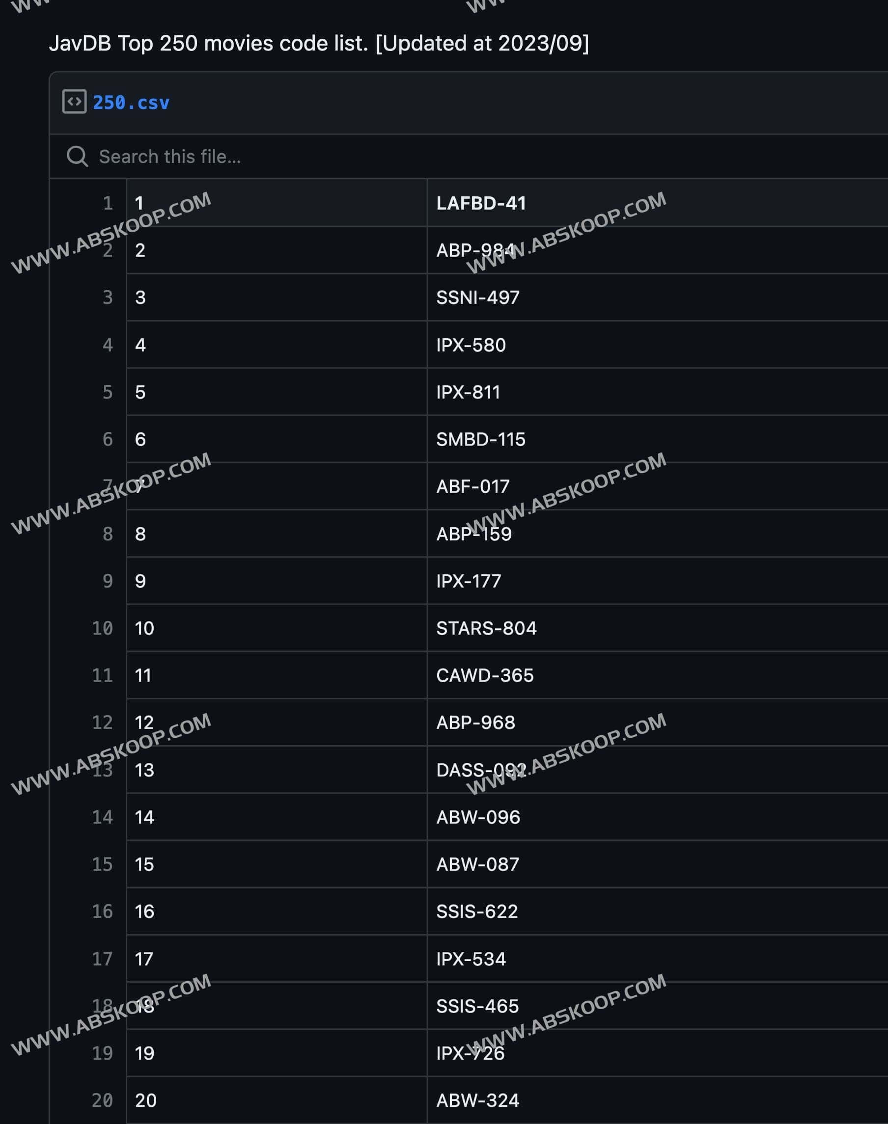 一个网友,在GitHub建立了一个仓库,专门收集根据一个日本老师教学数据库DB整理出来的TOP250课程,是一个CSV格式的文件,上面按照排名列举了日本老师教程课程的名称,感兴趣想要学习的可以拿着课程名称,到数据库DB网站进行搜索查找课程的磁力链接下载学习。