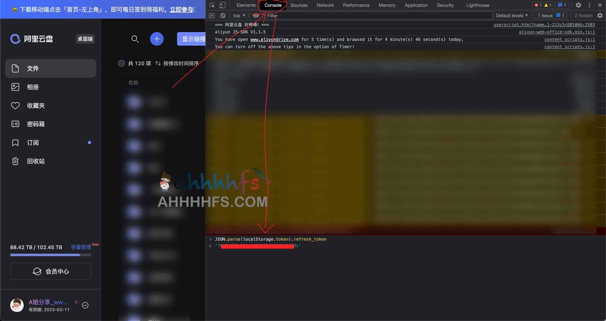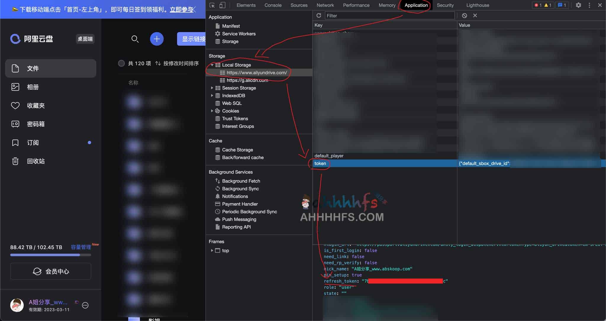 手动获取: 登录阿里云盘后,按F2,在开发者工具 -> Application -> Local Storage 中的 token 字段中找到。