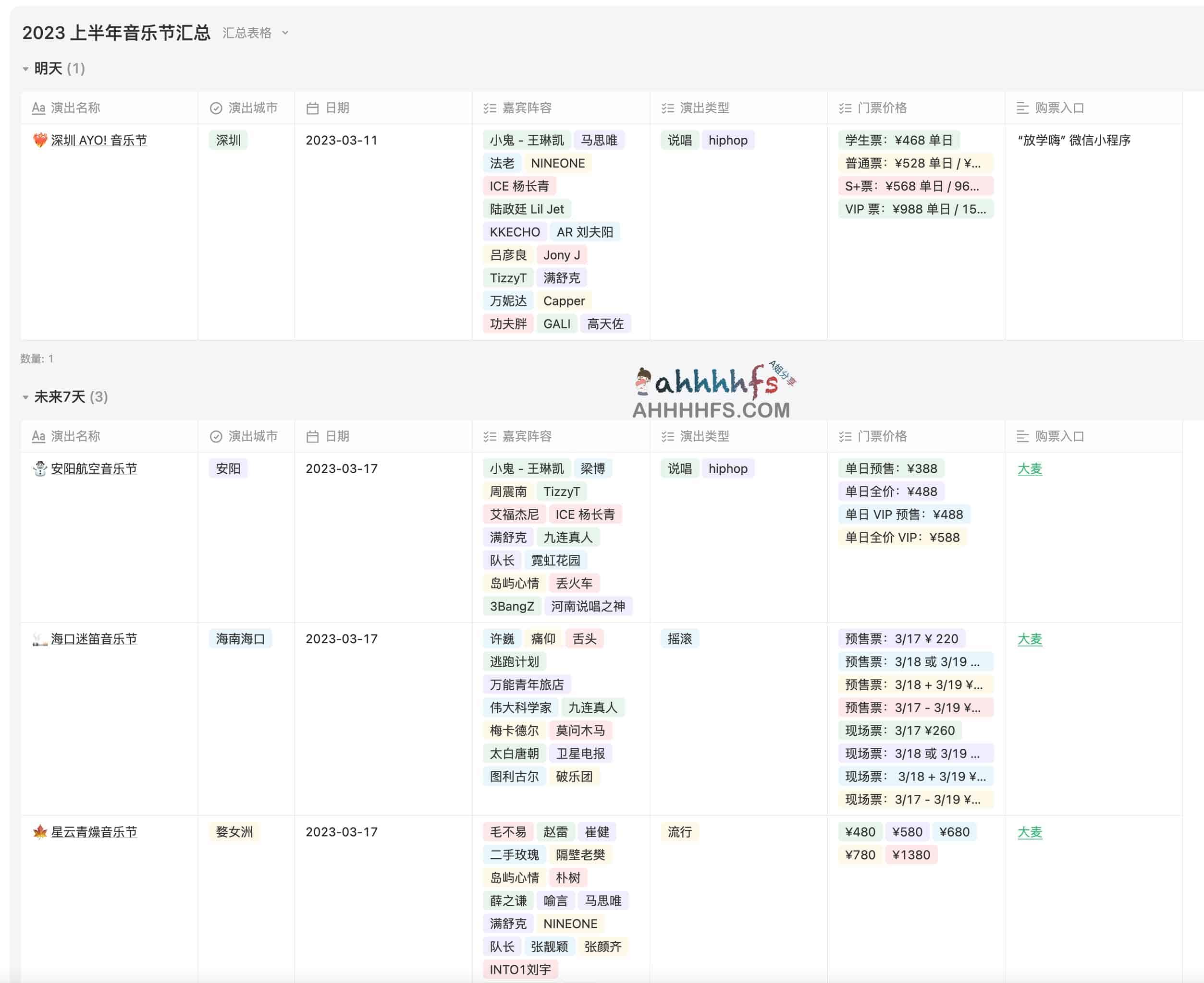 一份有网友总结的 2023 年 160 场音乐节 + 演唱会超全汇总!附时间 / 阵容 / 购票入口等,这篇文章包含了 2023 年 160+ 场国内(包括港澳台)音乐节 + 演唱会的信息汇总,包括:日期、演出城市、嘉宾阵容、演出类型、门票价格,以及你去音乐节之前需要了解的一切必备事项。每一场演出我们都附上了购票入口,你可以一键直达 ,对此类活动感兴趣的同学可以收藏备用。