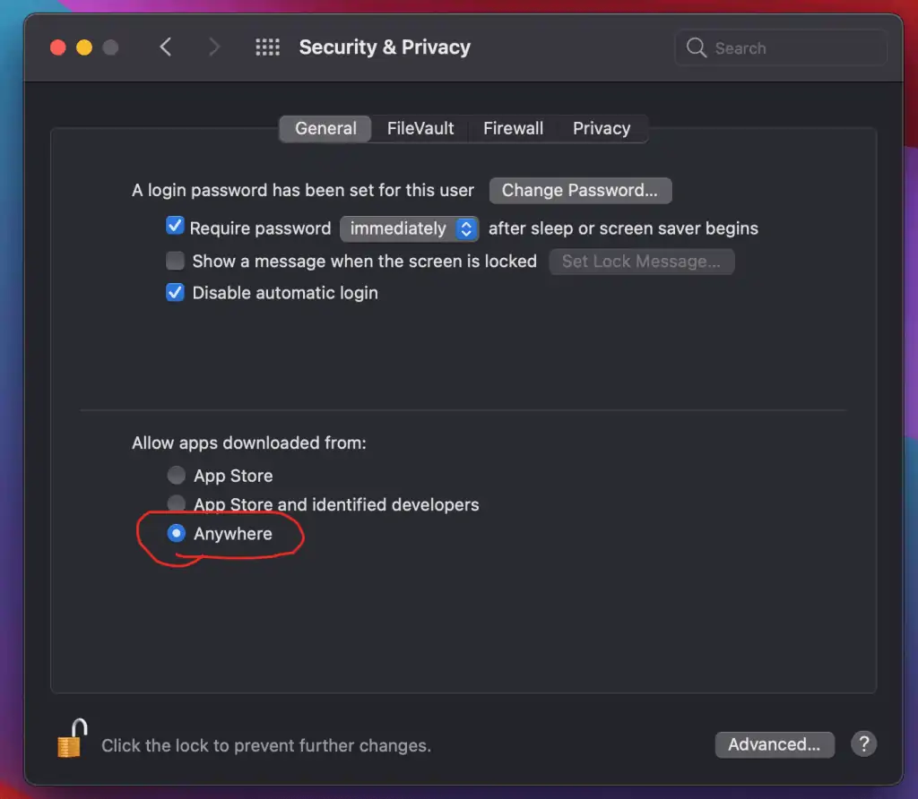 打开 系统偏好设置→安全性与隐私→通用→解锁→允许从以下位置下载App→更改为 任何来源