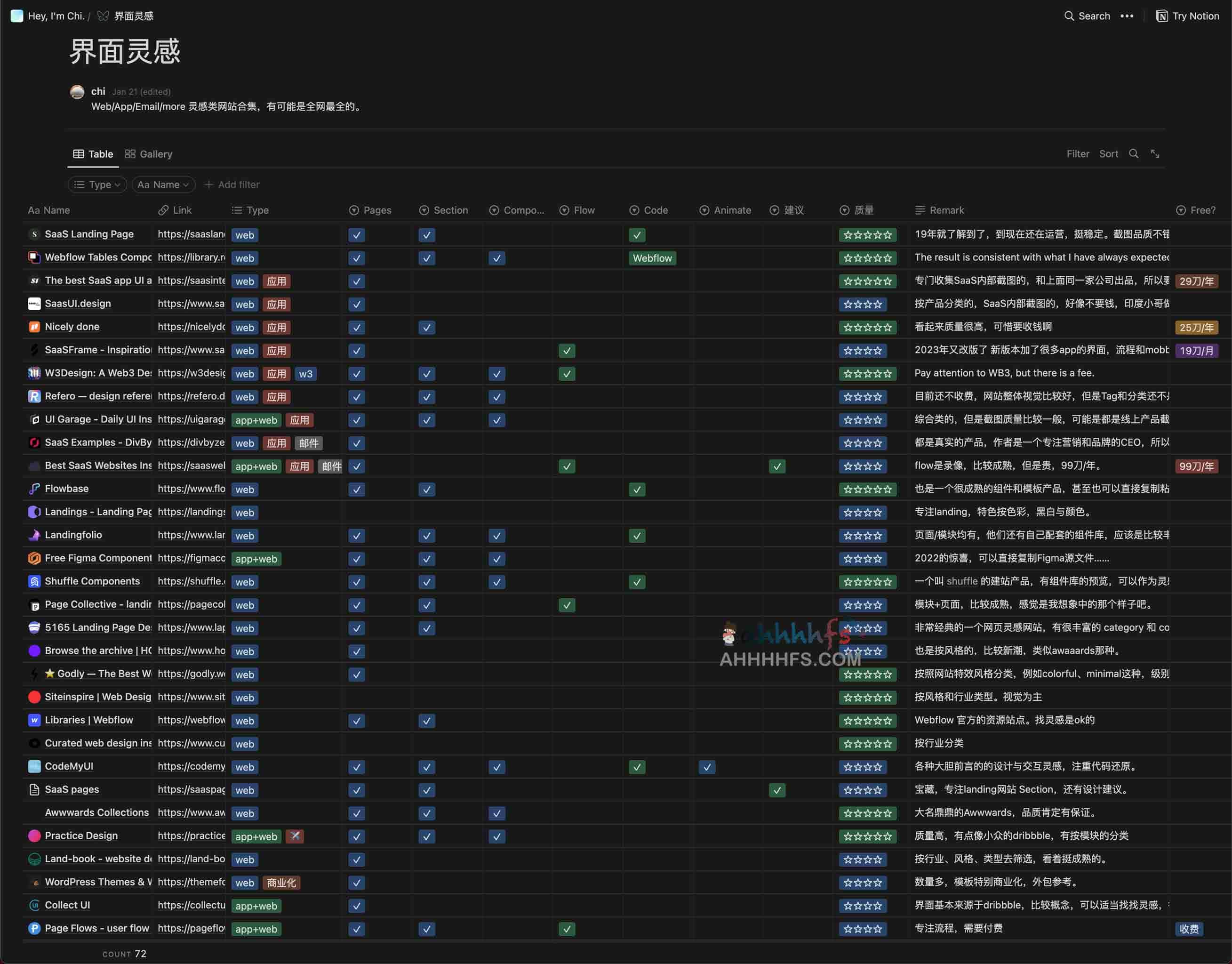 界面灵感,一个Notion站点,设计师灵感来源网站集合,作者是一个UX/UI 设计师,这个notion站点主要内容是作者平时收集的Design&Code资源,希望对一些设计师设计有所帮助,灵感设计网站收集的蛮丰富的,而且每个网站都有标注到作者的评价。
