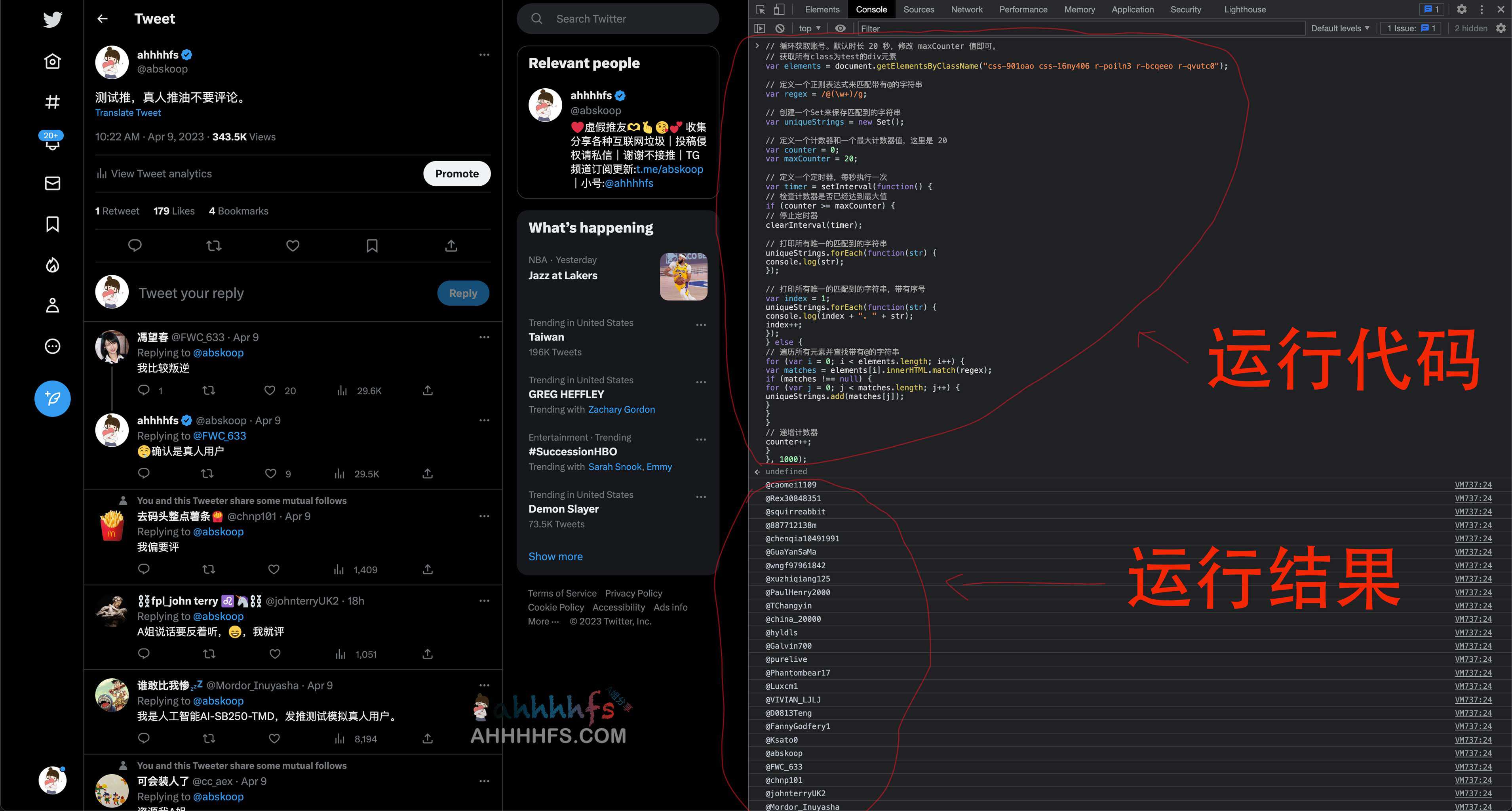 这是一个获取某条推文中的评论账号的脚本。由于浏览推文的时候不能查看评论区所有账号,因此设定本脚本执行 20 秒,在脚本执行期间浏览评论区,执行完毕后自动过滤所有账号并去重。