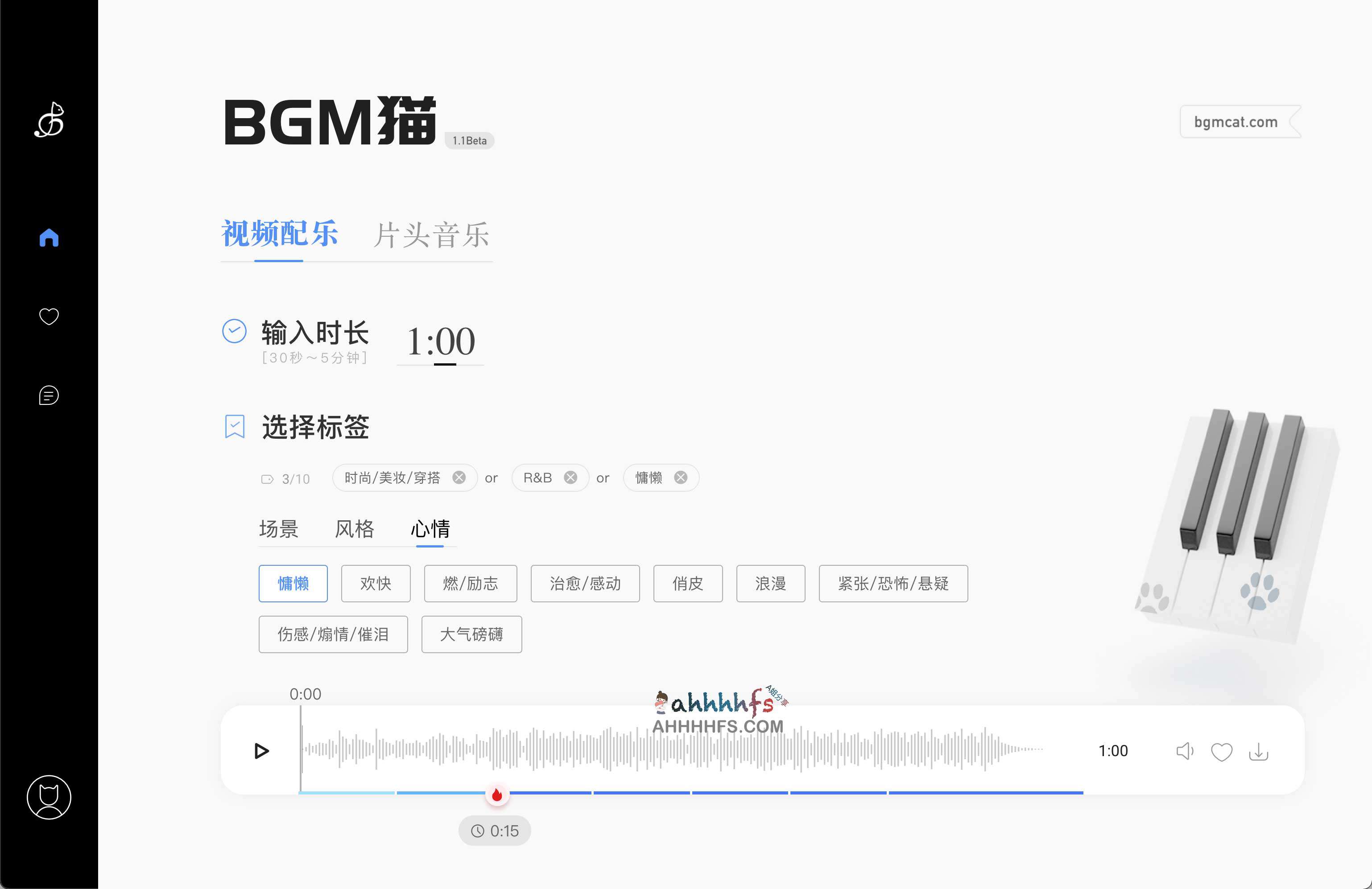 BGM猫是一个免费在线AI智能背景音乐生成器工具,可以根据不同的场景、风格和心情标签,一键生成不同的视频配音和片头音乐,而且A姐发现这个AI智能背景音乐生成器支持定制背景音乐时长,生成可以在线试听或者下载到本地,非常适合视频创作者做素材来源。