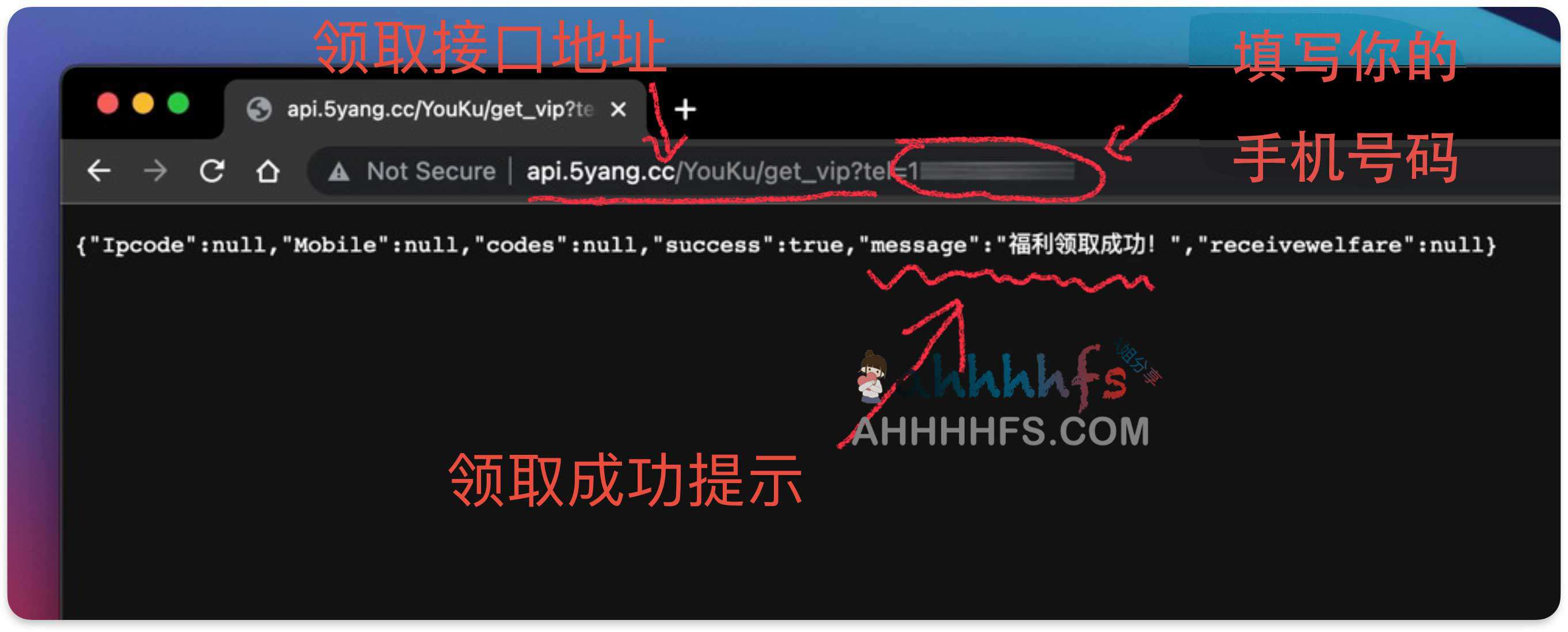 领取地址:http://api.5yang.cc/YouKu/get_vip?tel=13888888888