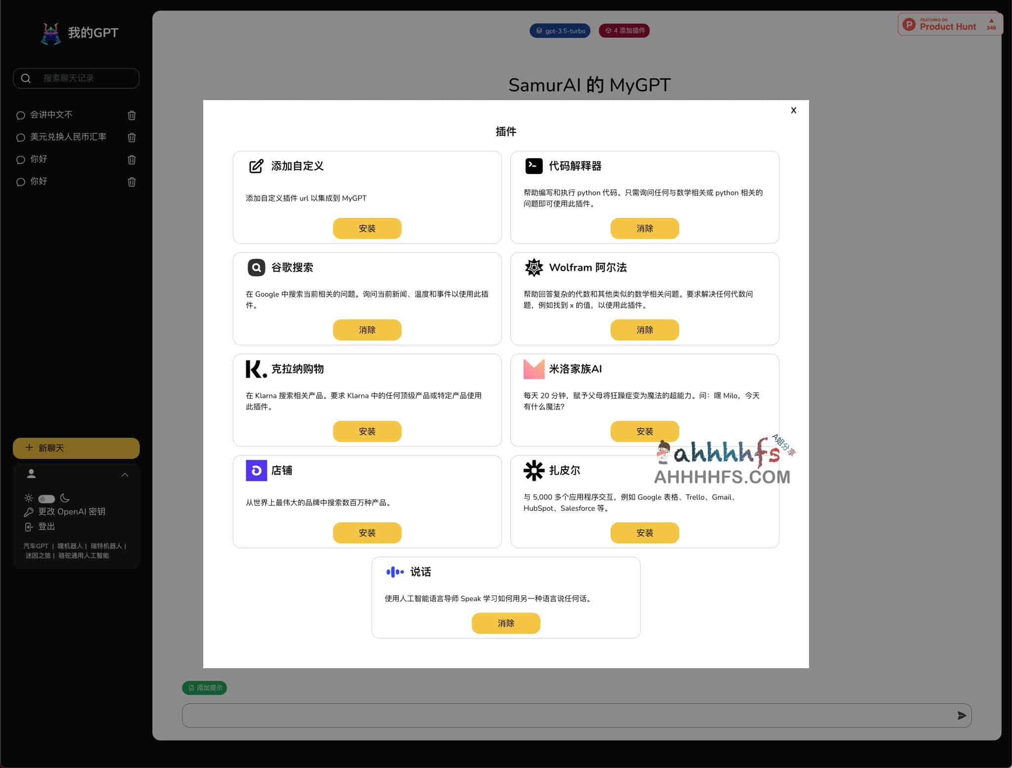MyGPT是一个基于ChatGPT api key开发的第三方ChatGPT界面,让用户无需订阅ChatGPT Plus 即可使用ChatGPT 插件功能,目前支持多款ChatGPT插件使用,支持GPT-4,内置提示词库,支持聊天记录和搜索,不过使用需要自备OpenAI key,使用需要注册登录,感兴趣的可以试试。