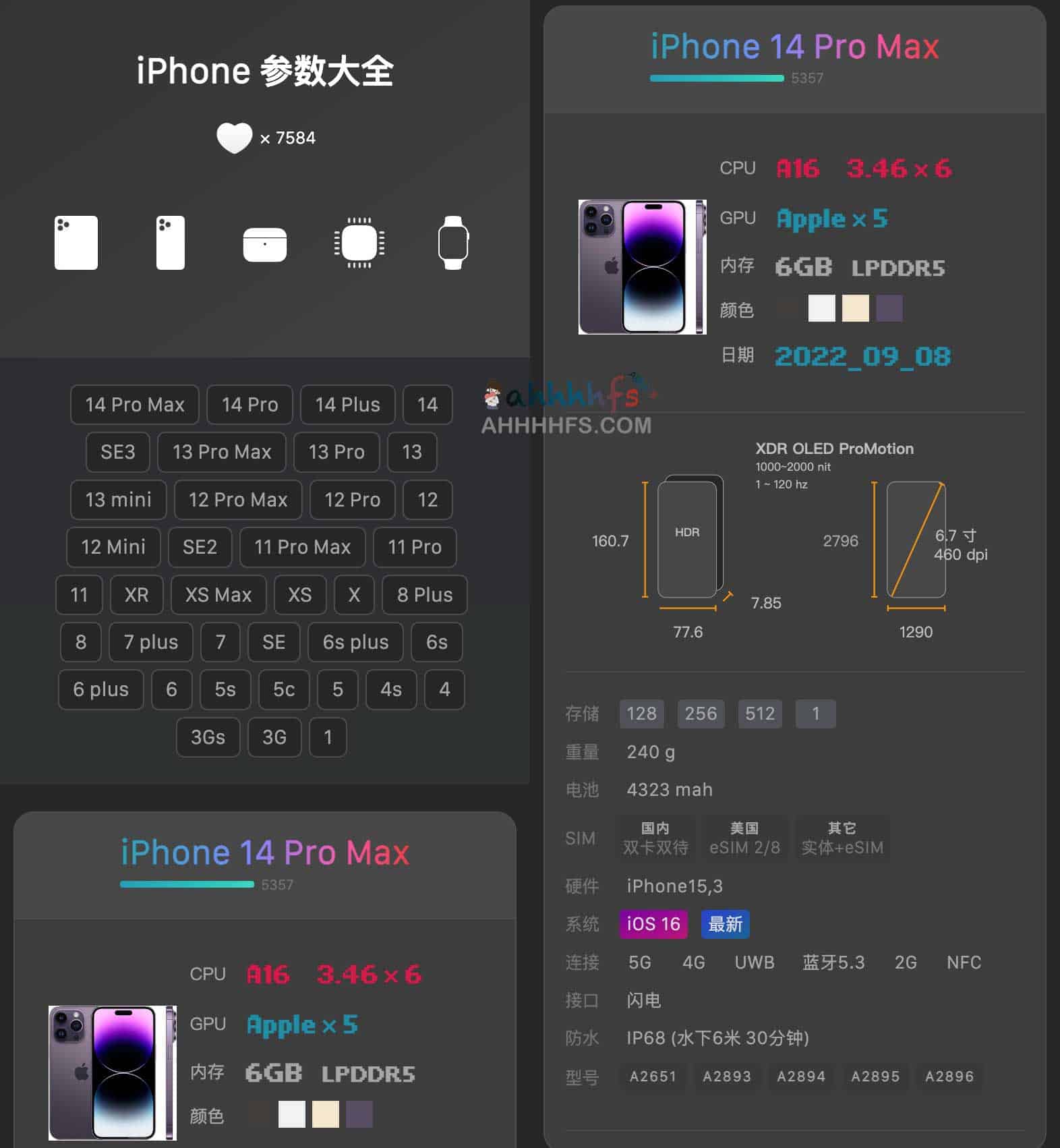 KyleBing,一个收集整理苹果产品参数大全的在线网站,包括iPhone、iPad、Apple Chip、AirPods和Apple Watch等等,数据都来源于 wikipedia,而且网站界面UI做的也非常美观,选购Apple产品对比起来也非常清晰,618等等购物节想要入手苹果产品的可以拿来做参数对比。