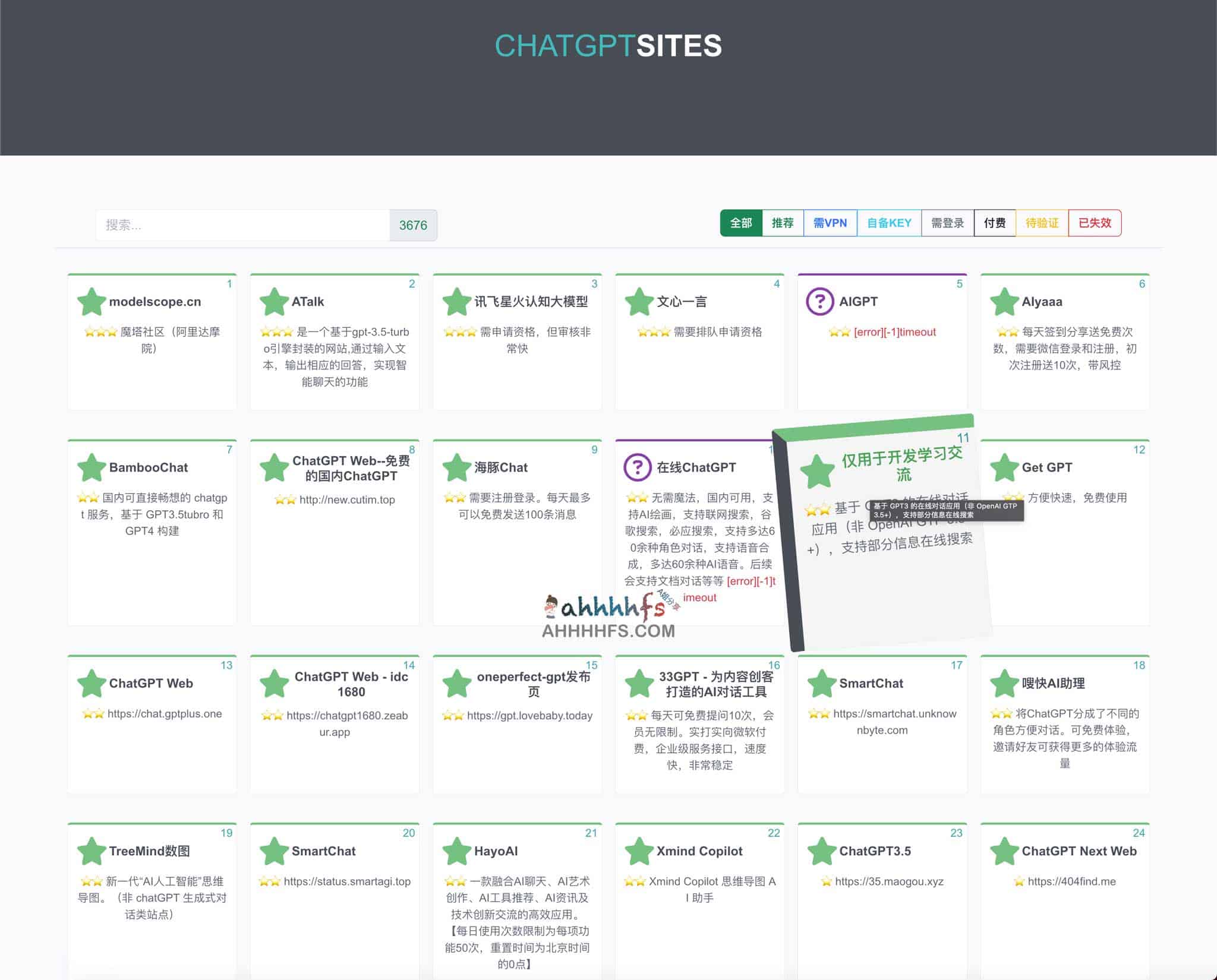 CHATGPTSITES,是一个国内可用的 ChatGPT 在线体验免费网站列表导航,而且网站定时任务每日更新网站,目前收集了三千多个ChatGPT在线体验网站,对ChatGPT感兴趣有没有ChatGPT账号的同学可以到网站找一个流畅可用的ChatGPT网站体验试试。