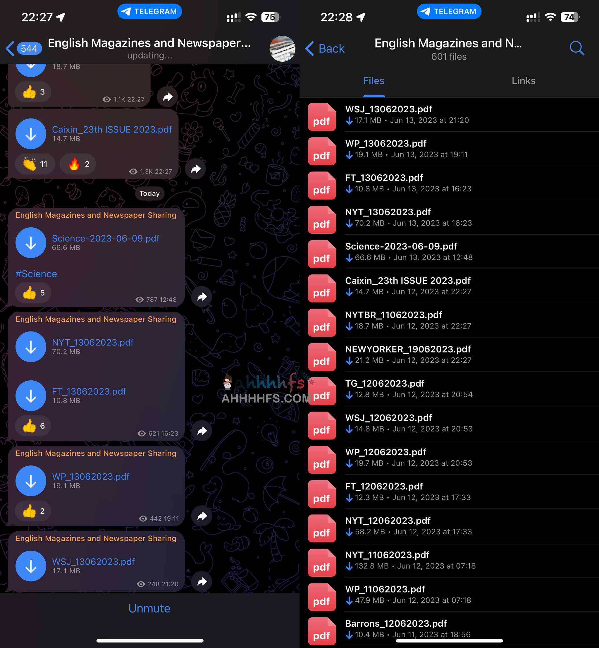 MagzineSharing是一个telegram电报频道,主要免费分享一些国外著名的英文杂志报刊,例如华尔街日报、华盛顿邮报、纽约时报等等,并且提供下载,好像是用爱发电的,直接就可以下载了,不用其他额外操作,也没有什么奇怪的广告,低调用。