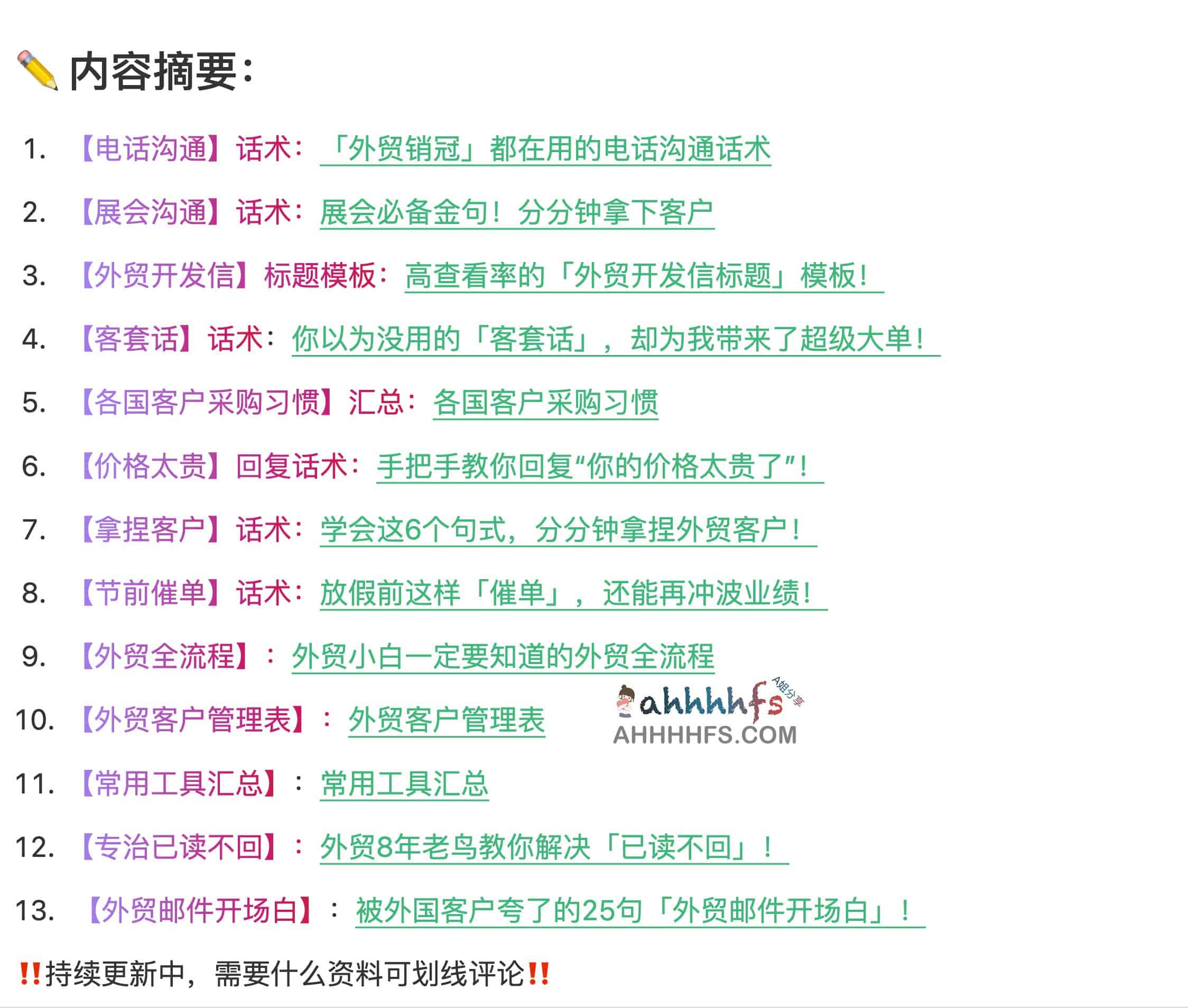 Lisa聊外贸,是一份在线在线外贸行业知识库,网友从业外贸行业8年总结的,知识库包括电话邮件沟通话术,发言模版、节前催单话术、外贸常用工具等等,比较丰富,感兴趣的同学可以到知识库学习学习。