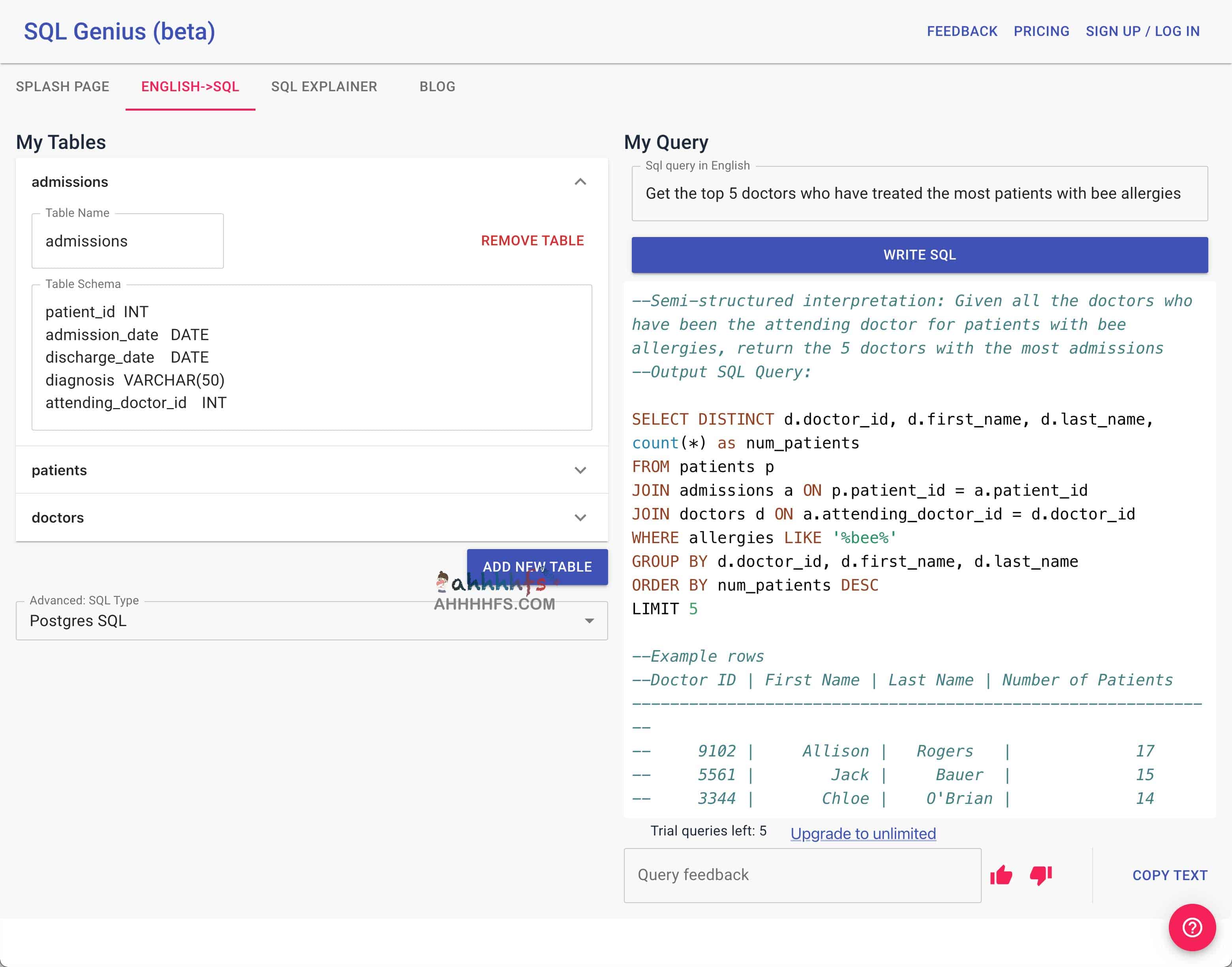 SQL Genius是一款在线人工智能AI数据库SQL生成器和解析器工具,无需掌握编程技术或者数据库语法等技巧,用户即可轻松使用简单的英语编写SQL语句,或者对SQL语句进行解析,不过界面是英文的,对于那些数据库入门不熟悉SQL语言的用户而言,是一款非常不错的实用的AI数据库SQL辅助工具。