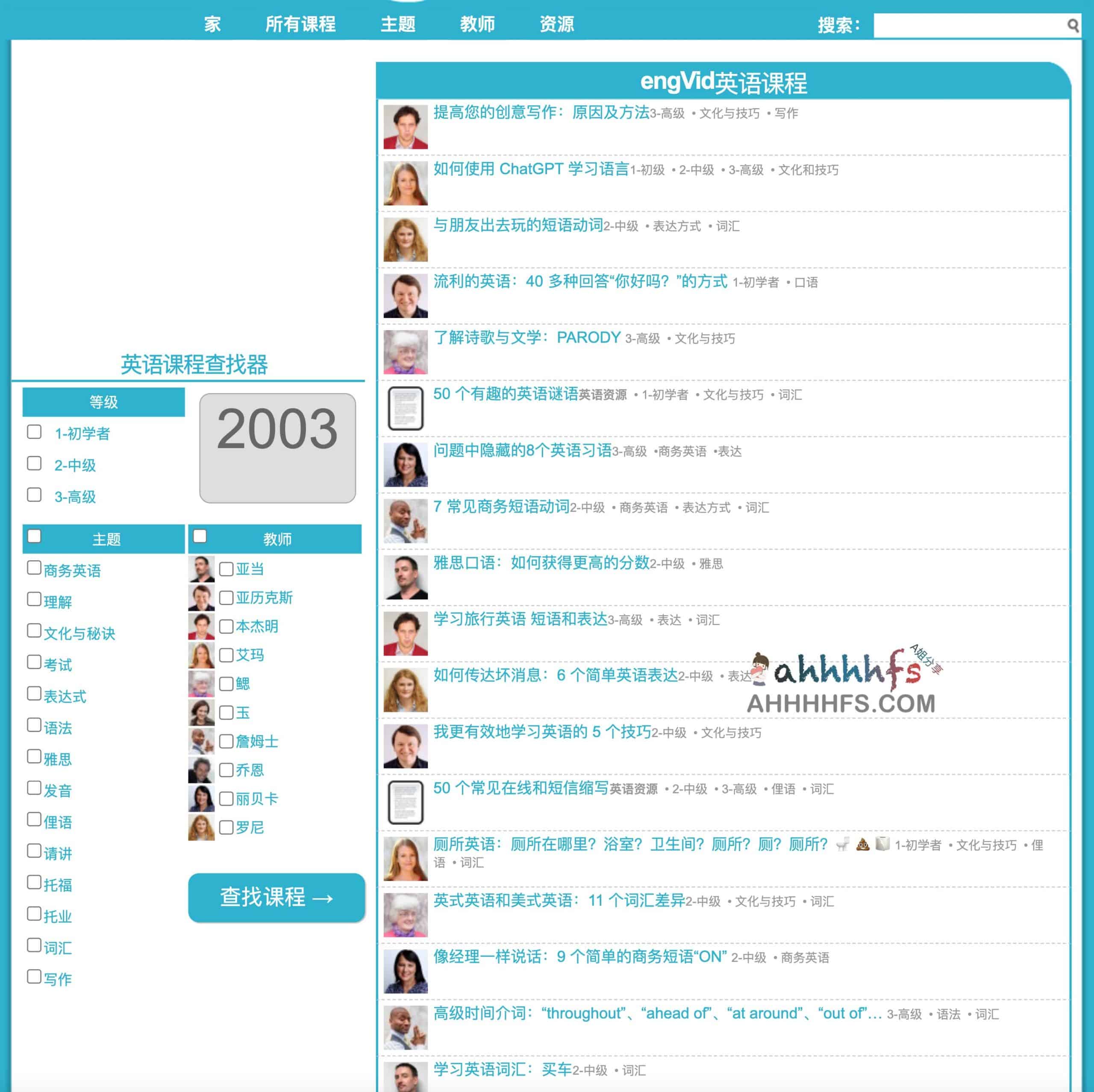 engVid还为学习者提供了一个英语课程查找系统,学习者可以按照程度和水平(初级、中级、高级),话题(商务英语、阅读理解、文化、考试、常用表达法、语法、雅思考试、发音、俚语、口语、托福、TOEIC、词汇、写作),或教师(Gill, Ronnie, Emma, Rebecca, Jade, Benjamin, Alex, James, Adam)三个维度检索和选择课程。