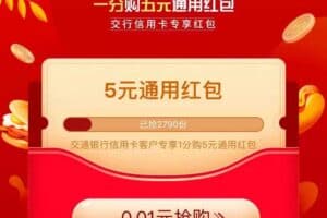 1.活动期间在饿了么指定页面使用交通银行信用卡支付0.01元,即可获得5.00元通用红包,每天10:00:00开抢,每日限量2万张,先到先得抢完为止,红包有效期7天。