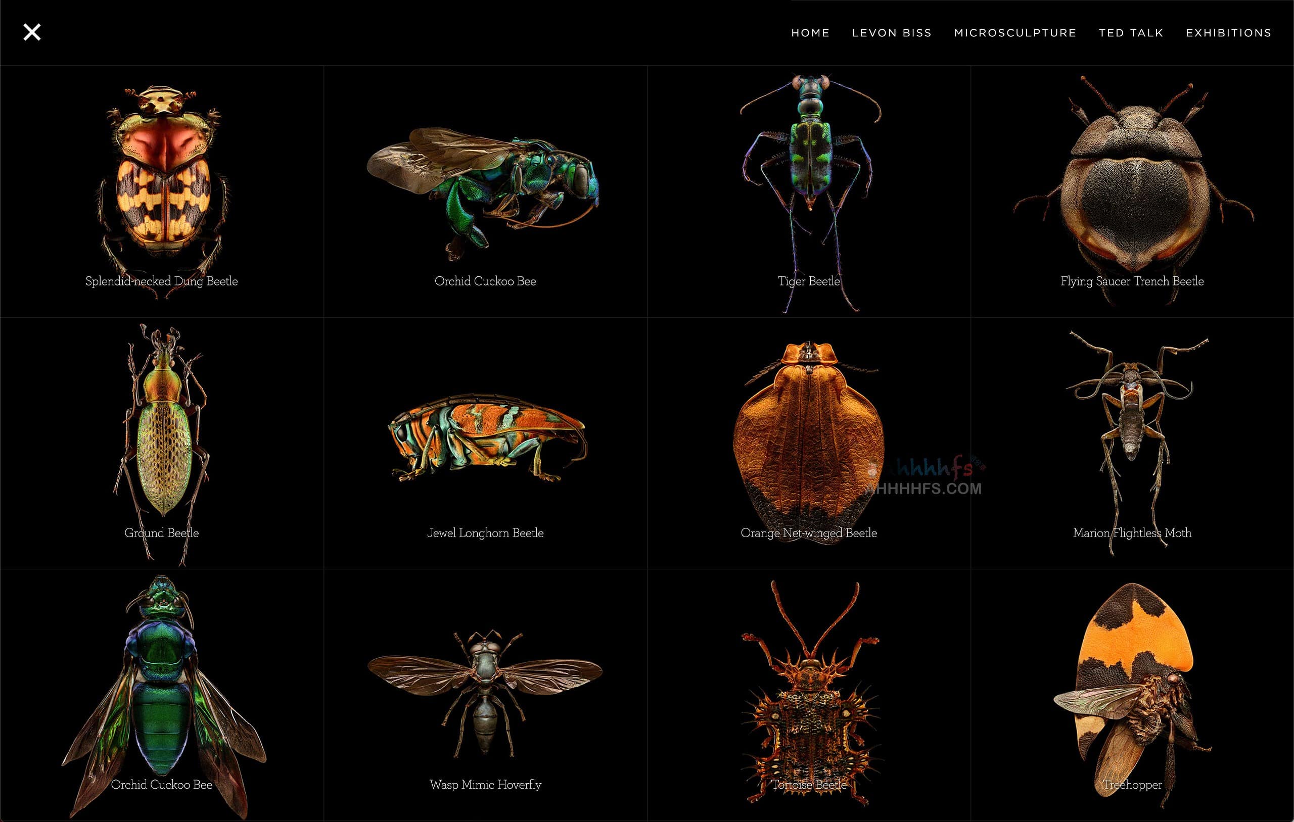 Microsculpture-莱文·比斯的昆虫肖像,来自牛津大学自然历史博物馆的藏品,网站展示了由摄影师莱文·比斯用独创的超显微摄影技术拍摄的昆虫特写照片,每个昆虫微观图都是由超过 8000 张独立图片制作而成,目前网站里目前有 34 个昆虫微观图,打开网站点击左上角的Explore即可探索,可以放大和缩小,非常清晰。