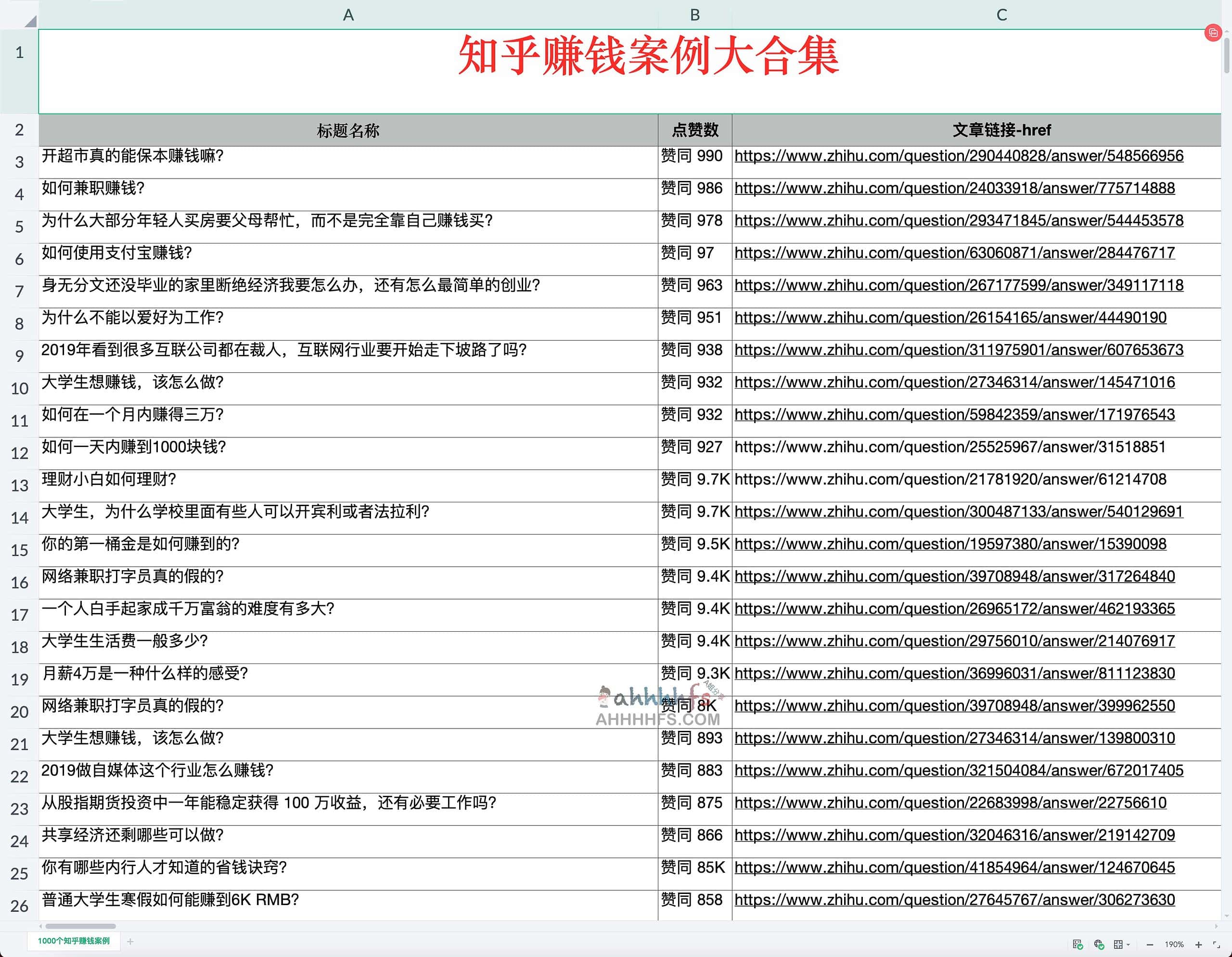 900+知乎赚钱案例大合集,网友真理的是一个xlsx文档,上面收集了900+个知乎赚钱案例,都是贴上了知乎赚钱案例的链接,感兴趣的同学可以保存学习。