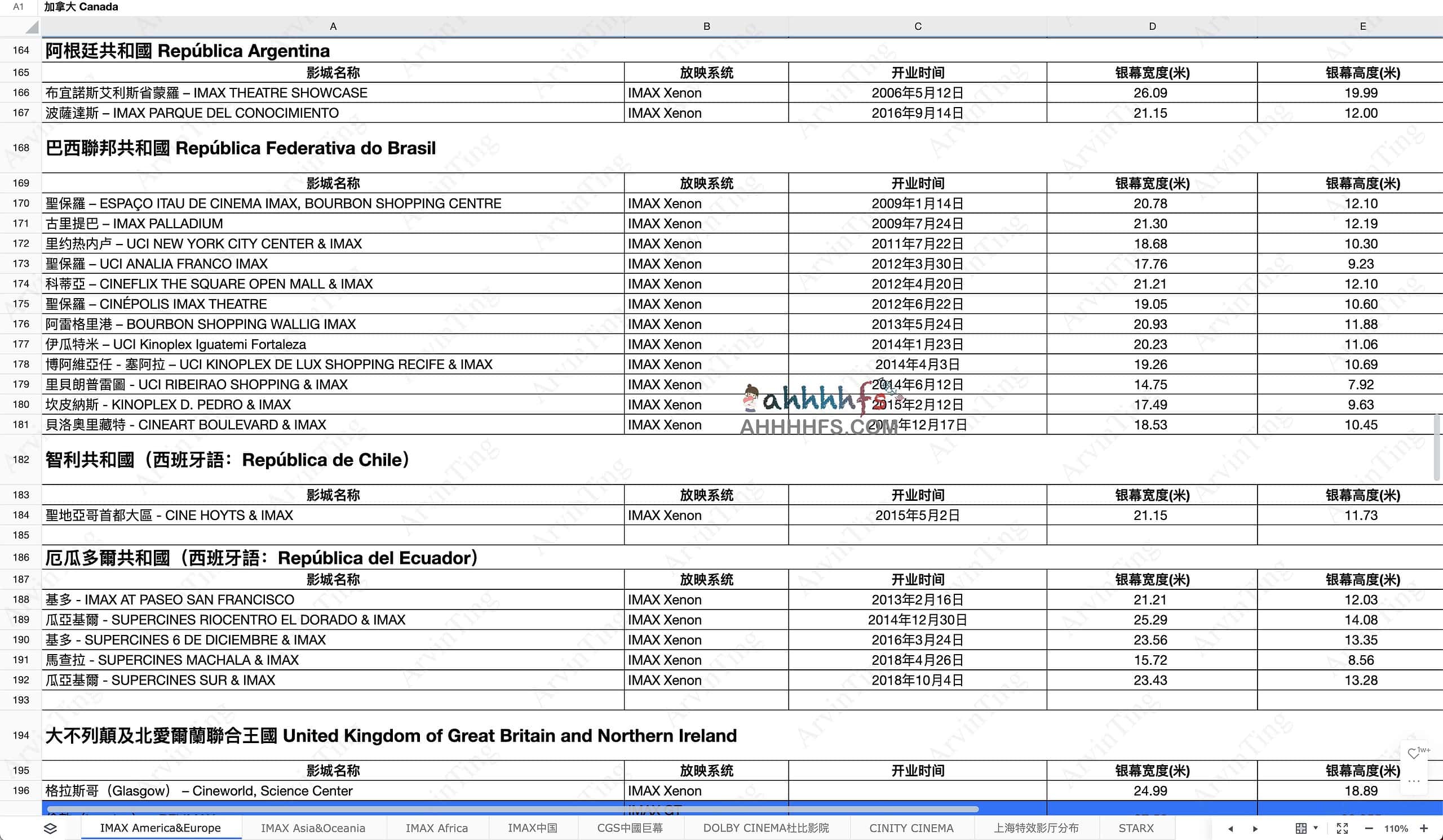 全球IMAX及其他系统影厅分布是网友整理的一份在线文档,上面收集了全球各地区的IMAX及其他系统影厅分布和IMAX放映系统演变等等,对于IMAX的影厅资料还是比较详细的,并且文档实时更新中,感兴趣的同学可以学习学习。
