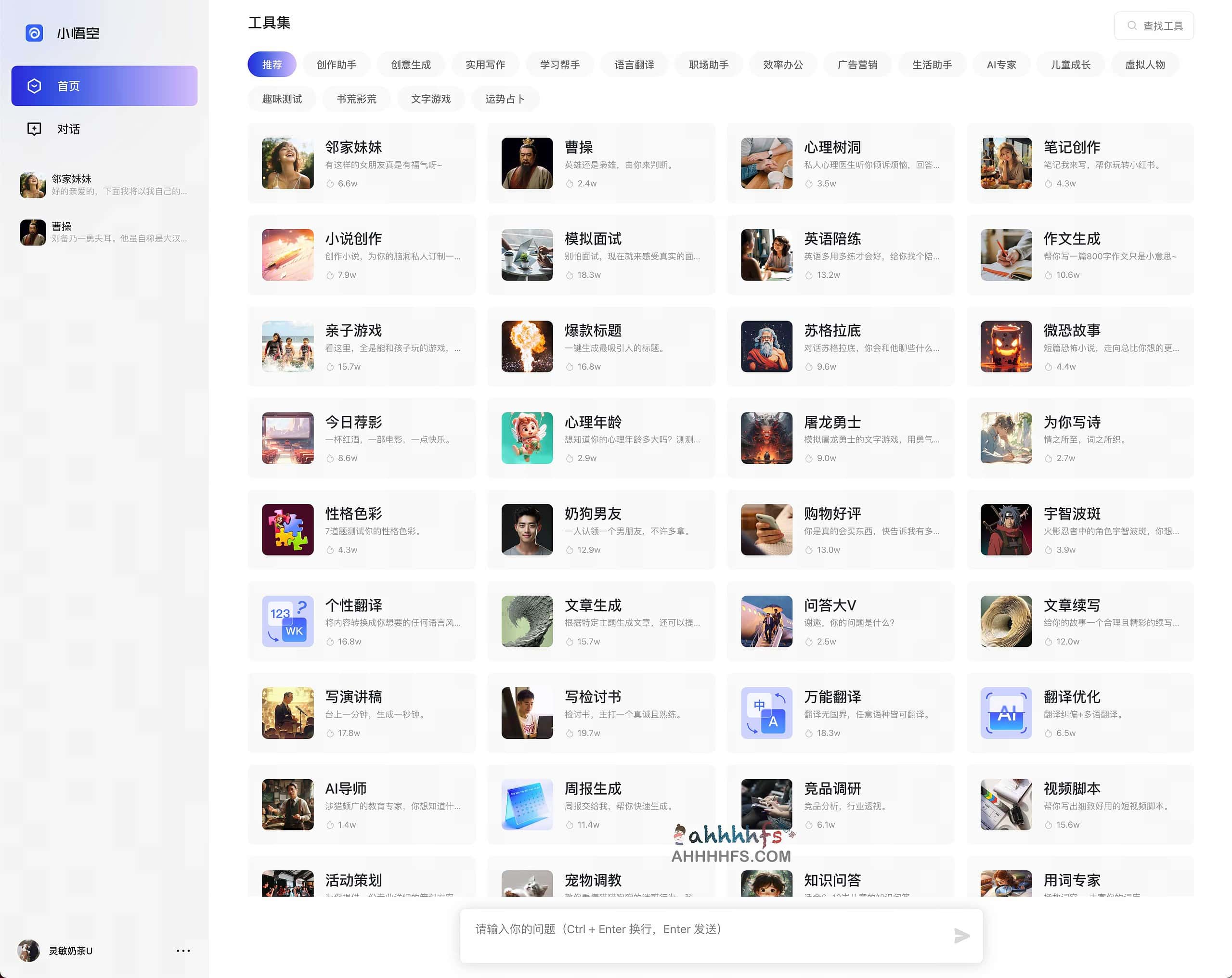 小悟空(原名悟空搜索)是字节跳动旗下推出的基于大语言模型的AI工具合集,支持智能对话和辅助推荐功能。目前包括20余分类,200+工具,满足你的工作、生活娱乐诉求,智能工具分类包括创作生成、学习提升、工作职场、专业咨询、虚拟角色、休闲娱乐等,用户可以使用该工具进行翻译、法律咨询、趣味测试等操作,使用需要注册登录。
