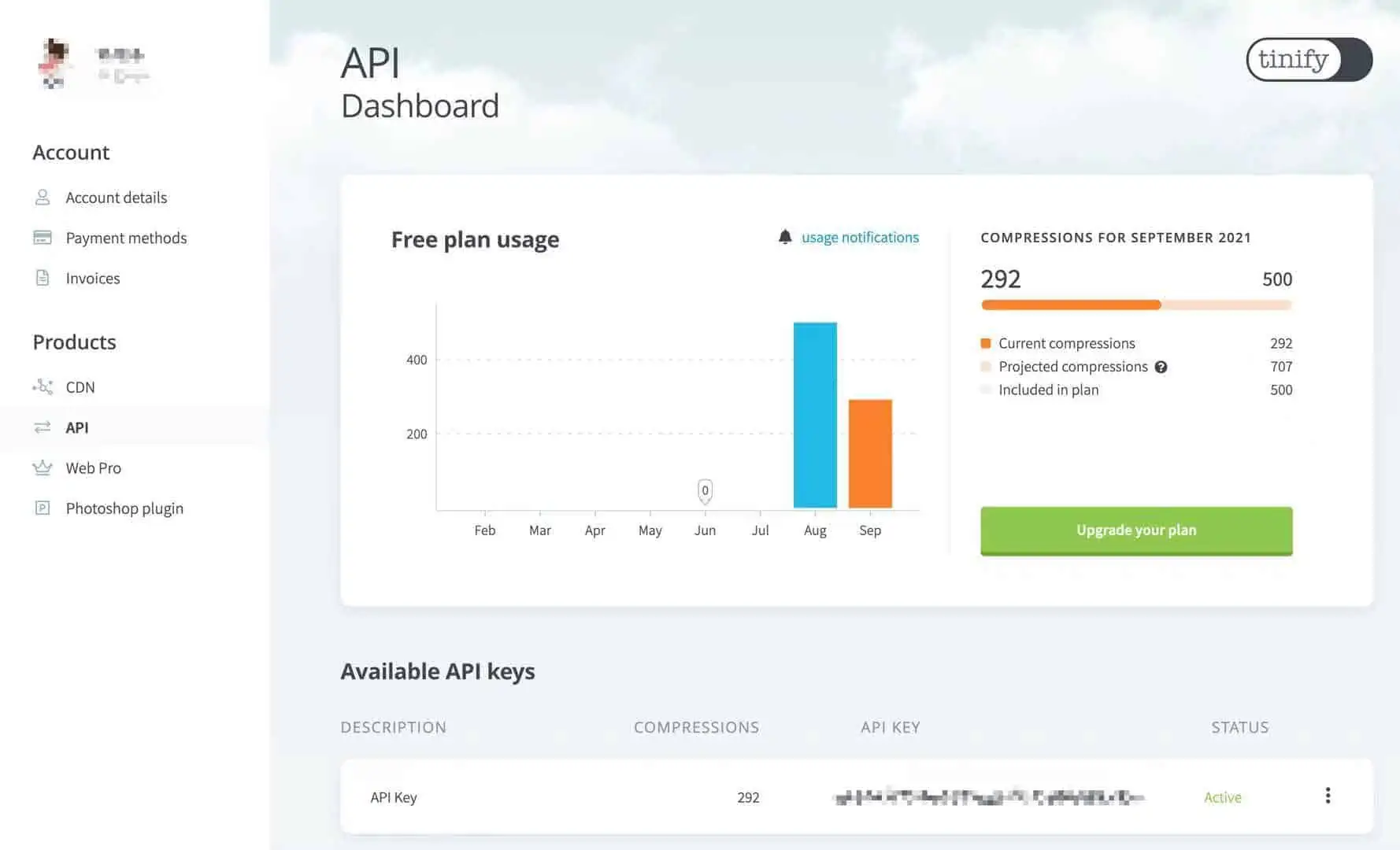 - 到这里注册API Key. 你也可以在打开TinyPNG4Mac的时候注册,免费用户每月500张配额。