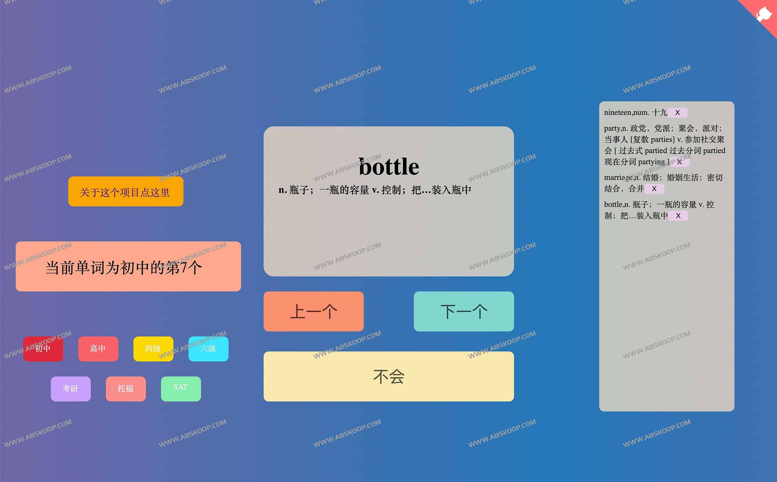单词之风是一个免费无广告在线背单词工具,像风一样丝滑的背单词,去除各种繁杂的功能,专注于背单词本身,单词词库涵盖了初中、高中、大学四六级、考研、托福和SAT等,满足各类人群需求,可以选择你希望背的单词级别,非常细滑,项目使用原生js构建,适合电脑端浏览器访问学习。