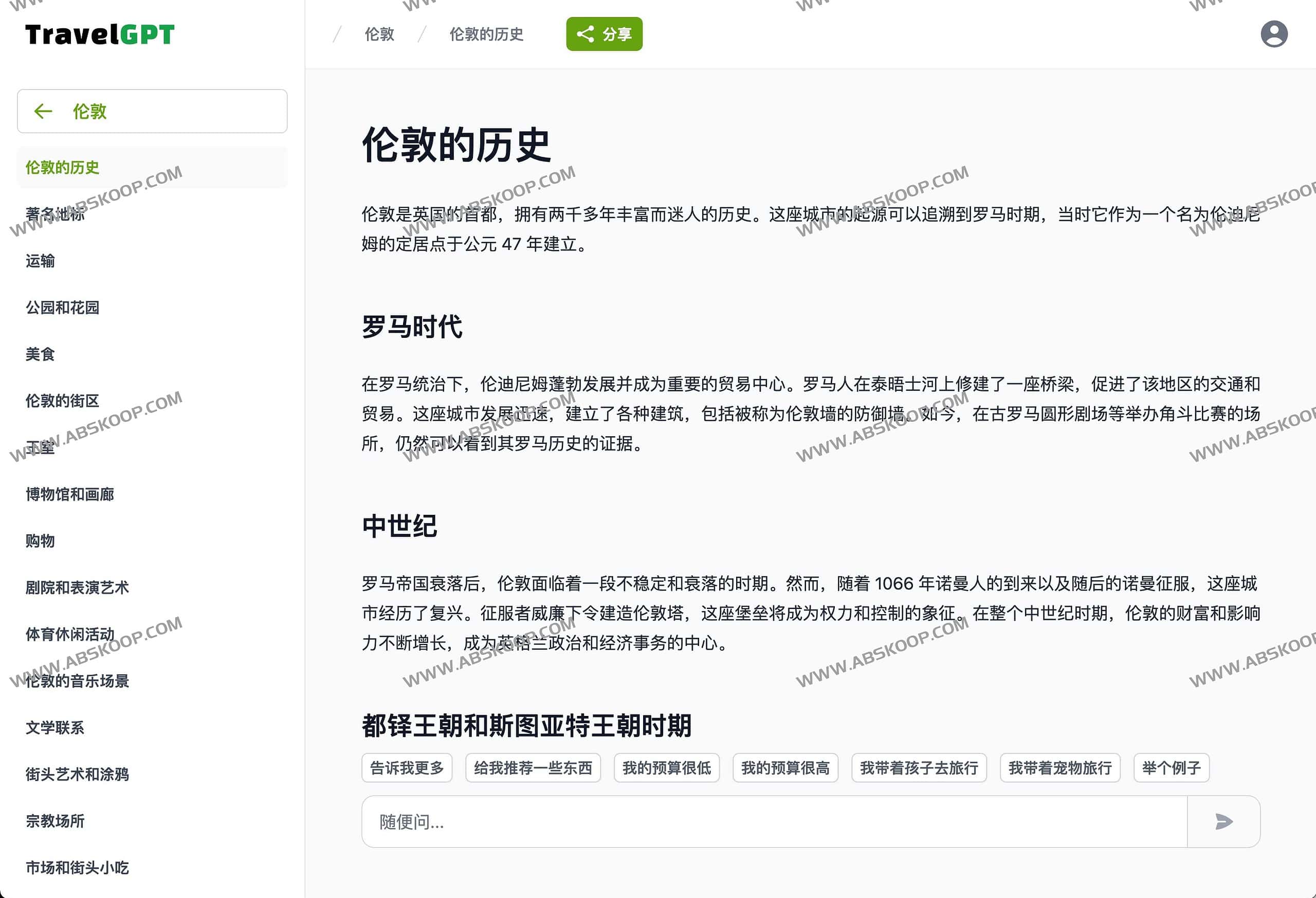 TravelGPT是一个在线AI旅游小助手,只需要输入目的地城市,AI将会搜索总结该城市特色、历史、交通、美食、购物、艺术、著名地标等等关于旅游城市的一切值得关注的信息,而且可以接着继续发问关于该城市更多的问题,相当于与一个在线的ChatGPT,帮你了解一切你想知道的。不过使用需要注册登录,有5个免费使用额度,支持英文等多国语言,暂不支持中文,可以使用浏览翻译即可。