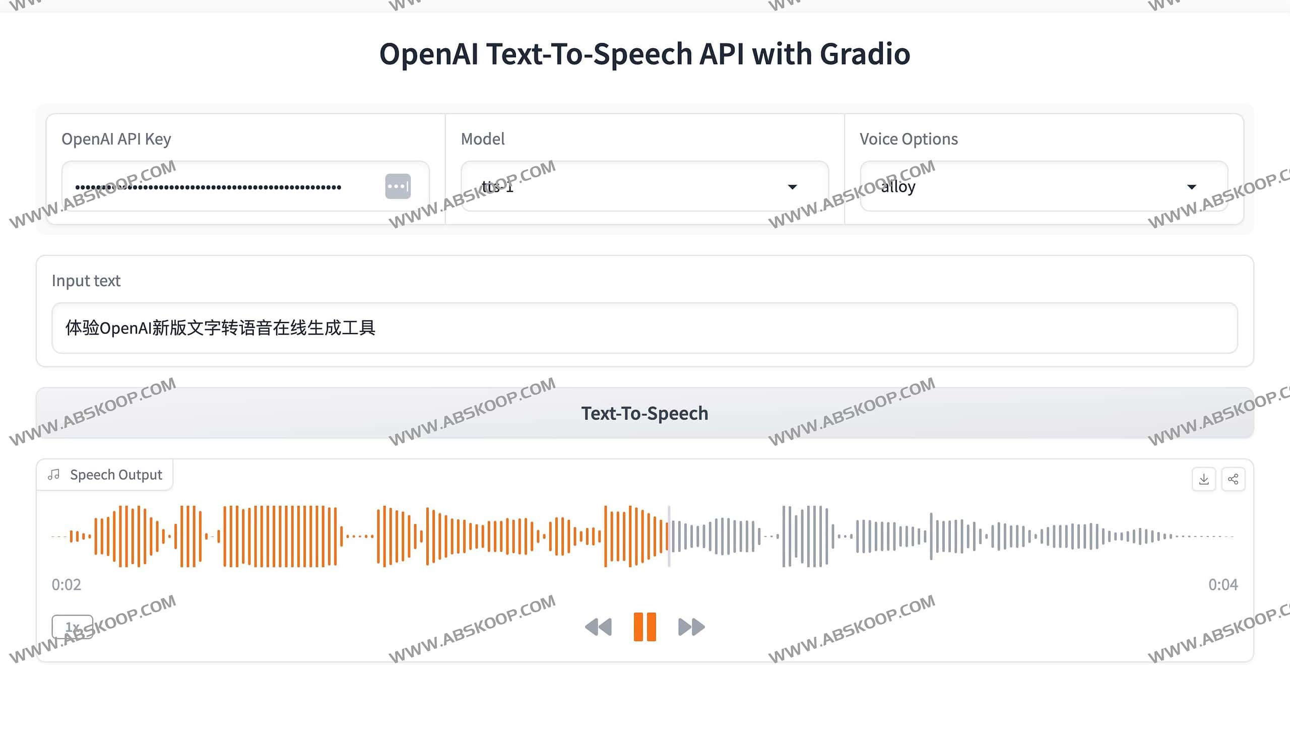 OpenAI TTS New(OpenAI Text-To-Speech API with Gradio)是一个体验OpenAI新版文字转语音在线生成工具,不过需要自备OpenAI API Key,目前支持7种声音和两种模型,文字转语音工具支持调节语速,而且支持下载文字转语音后的mp3格式的文件,感兴趣的同学可以到网站学习体验。