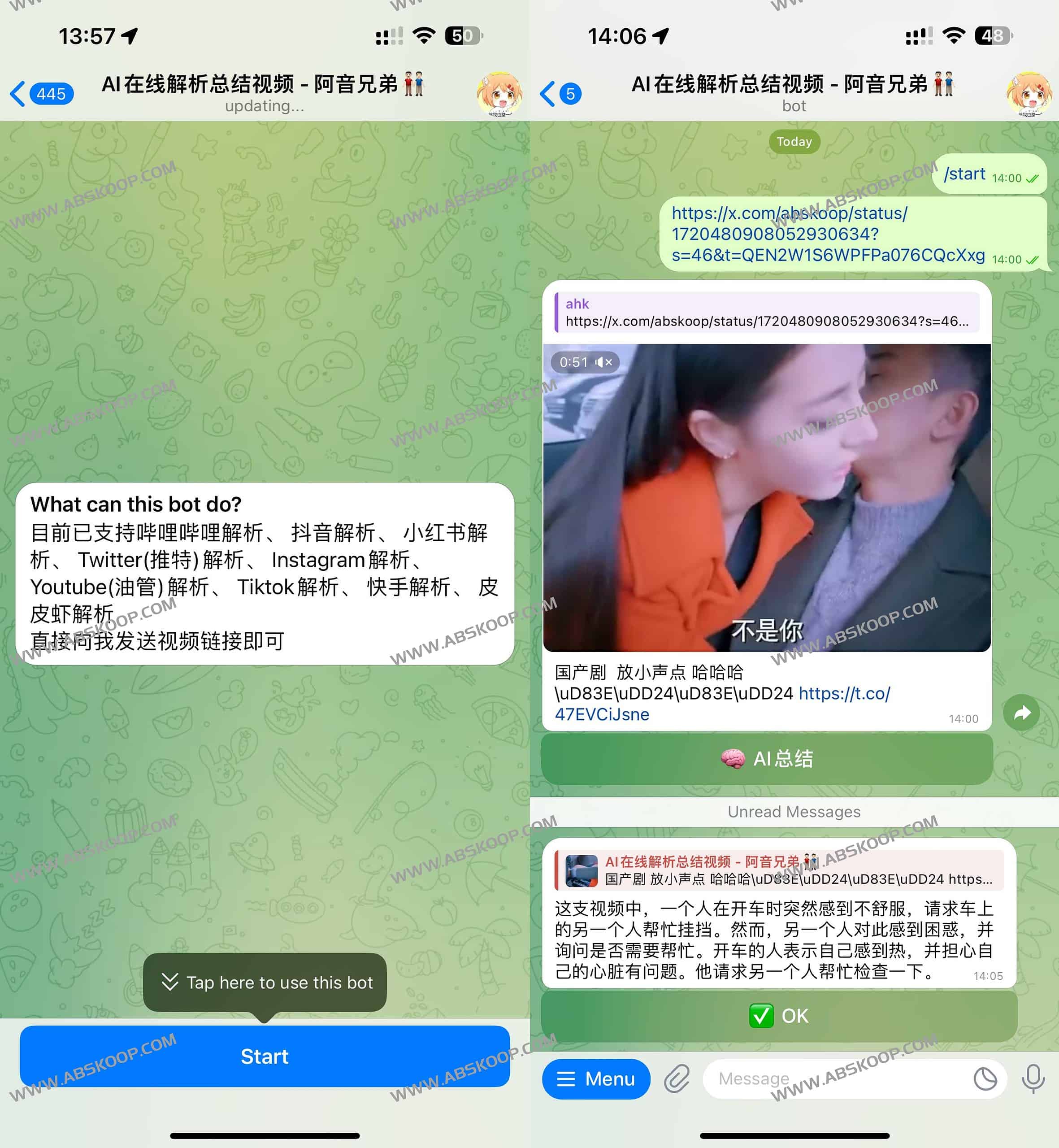 @bilibiliparse_bot是一个免费AI在线视频解析和视频总结Telegram机器人,直接发送视频链接即可解析下载视频,而且支持ai视频总结,对于解析完成后的视频一键总结视频内容,非常高效,目前已支持哔哩哔哩解析、 抖音解析、 小红书解析、 Twitter(推特)解析、 Instagram解析、 Youtube(油管)解析、 Tiktok解析、 快手解析、 皮皮虾解析、虎扑解析等等。