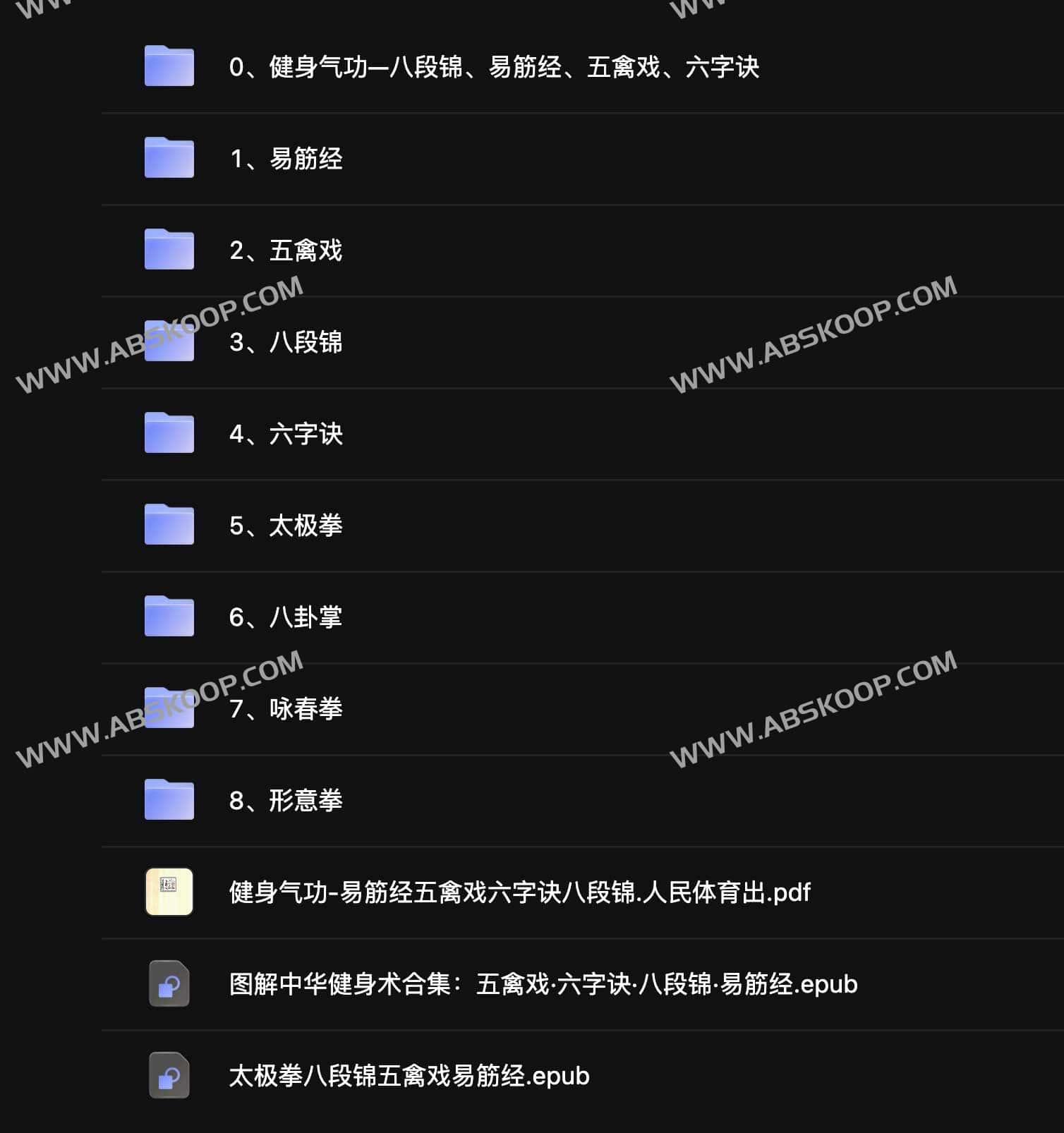 中华健身养生合集(电子书、视频),包含易筋经、五禽戏、太极拳、八卦拳、咏春拳等等,阿里云盘和夸克网盘资源下载。