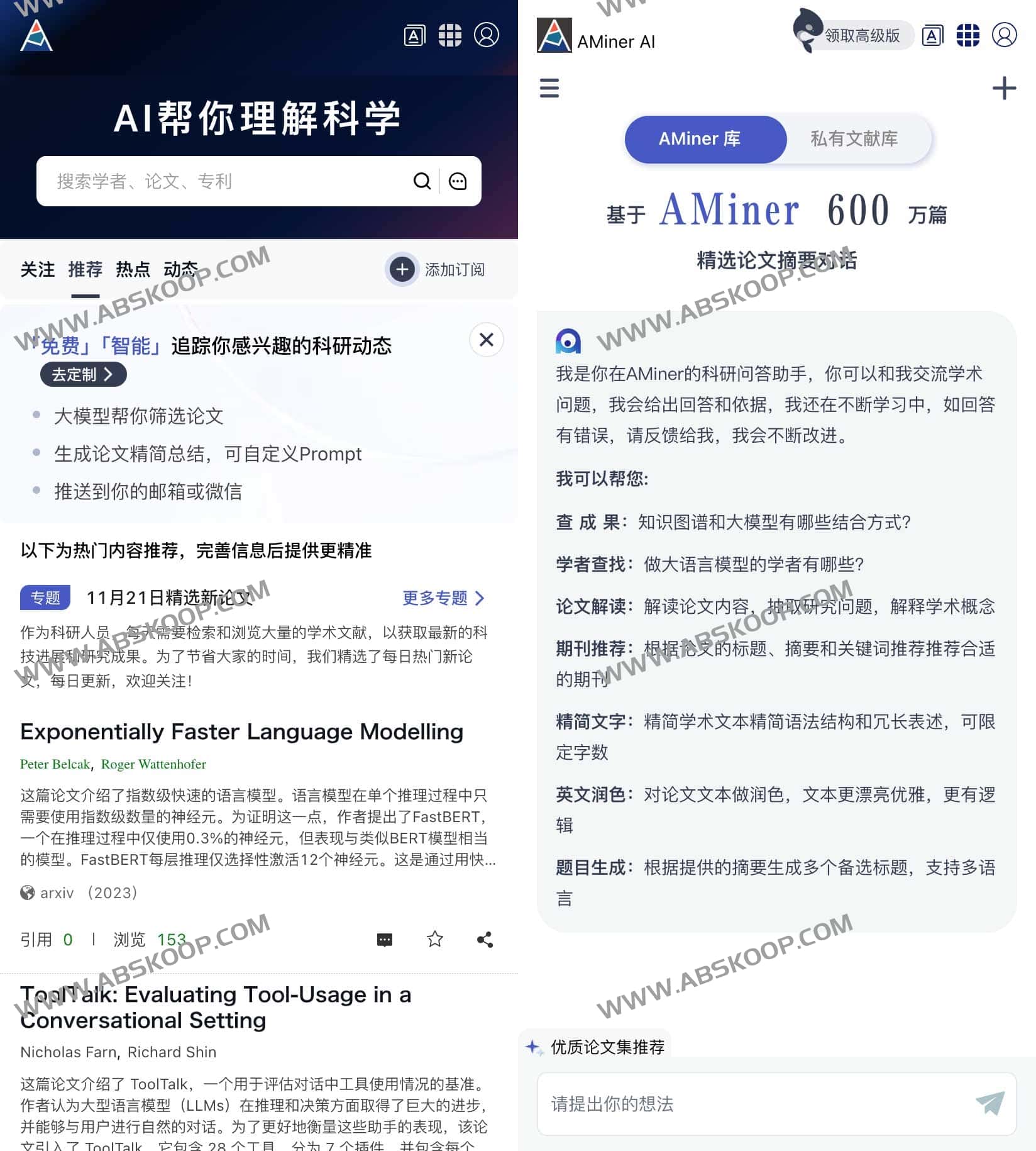 AMiner是一款AI论文专利学术检索平台,AI赋能科技情报挖掘,由清华大学计算机科学与技术系建立,包含了超过3.2亿学术论文、专利和1.33 亿学者的科技图谱,提供学术检索、论文检索,推荐订阅、论文专利、学者画像、文献追踪、趋势分析等科技情报服务,是拥有我国完全自主知识产权的学术科技情报大数据挖掘与服务系统平台,使用需要注册登录。