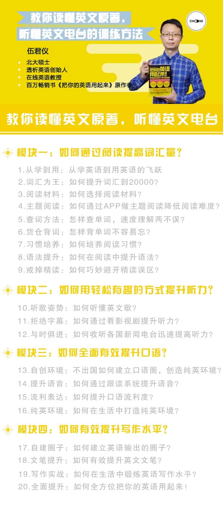课程通过20节视频课程,教你如何从0-1把英语用起来,选择正确努力的姿势,才是通往财富自由之路
