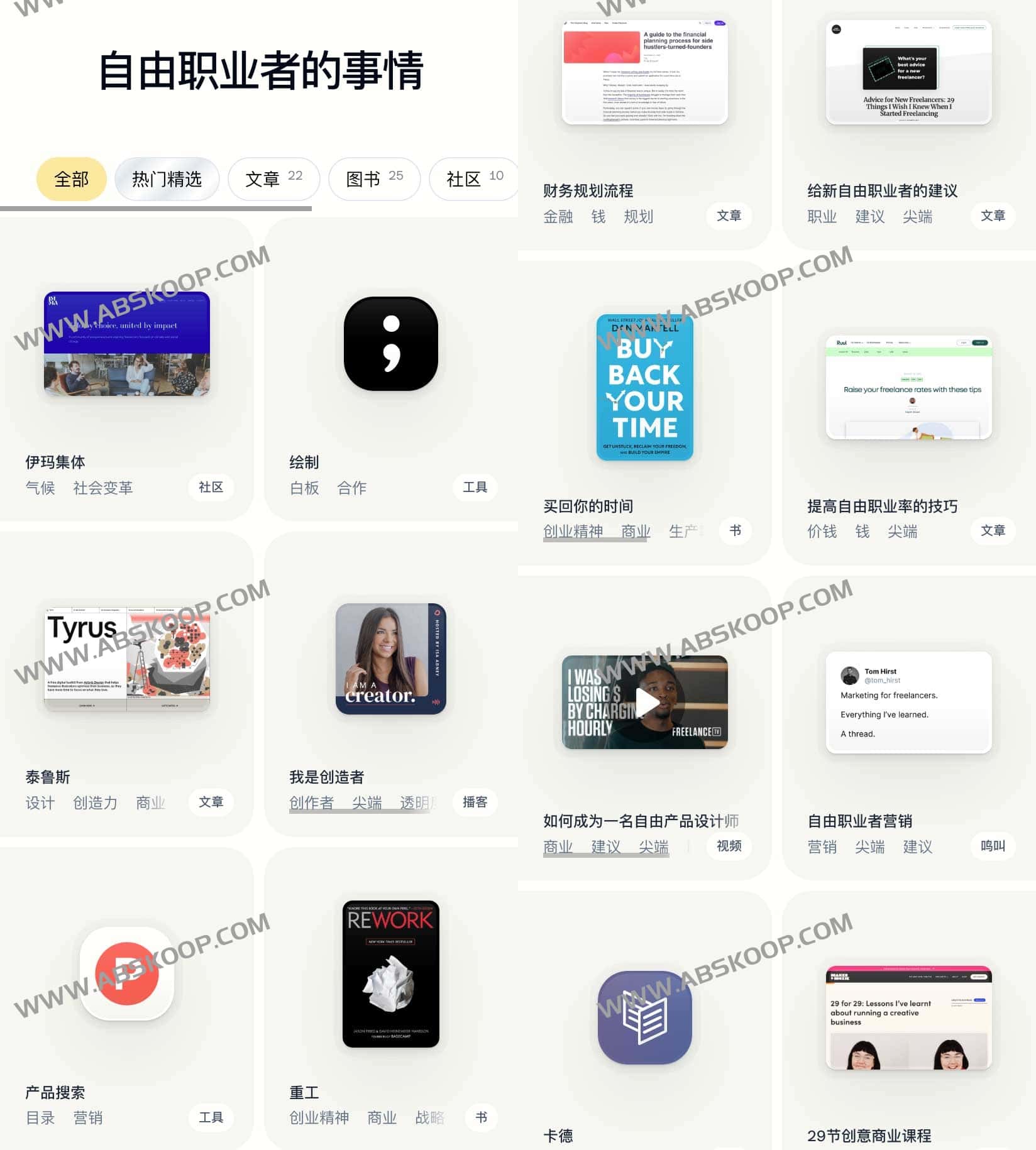 Freelance Things是一个为自由职业者精心策划的资源在线网站。成为自由职业者很难,里面充满了未知数,从很多方面来说,感觉就像你正在重新开始你的职业生涯,而Freelance Things 是一系列适合自由职业的资源,可帮助你开启自由职业之旅,目前包括文章、书籍、播客、社区、工具等等。当你成为自由职业者时,可以关注这些实用的知识。