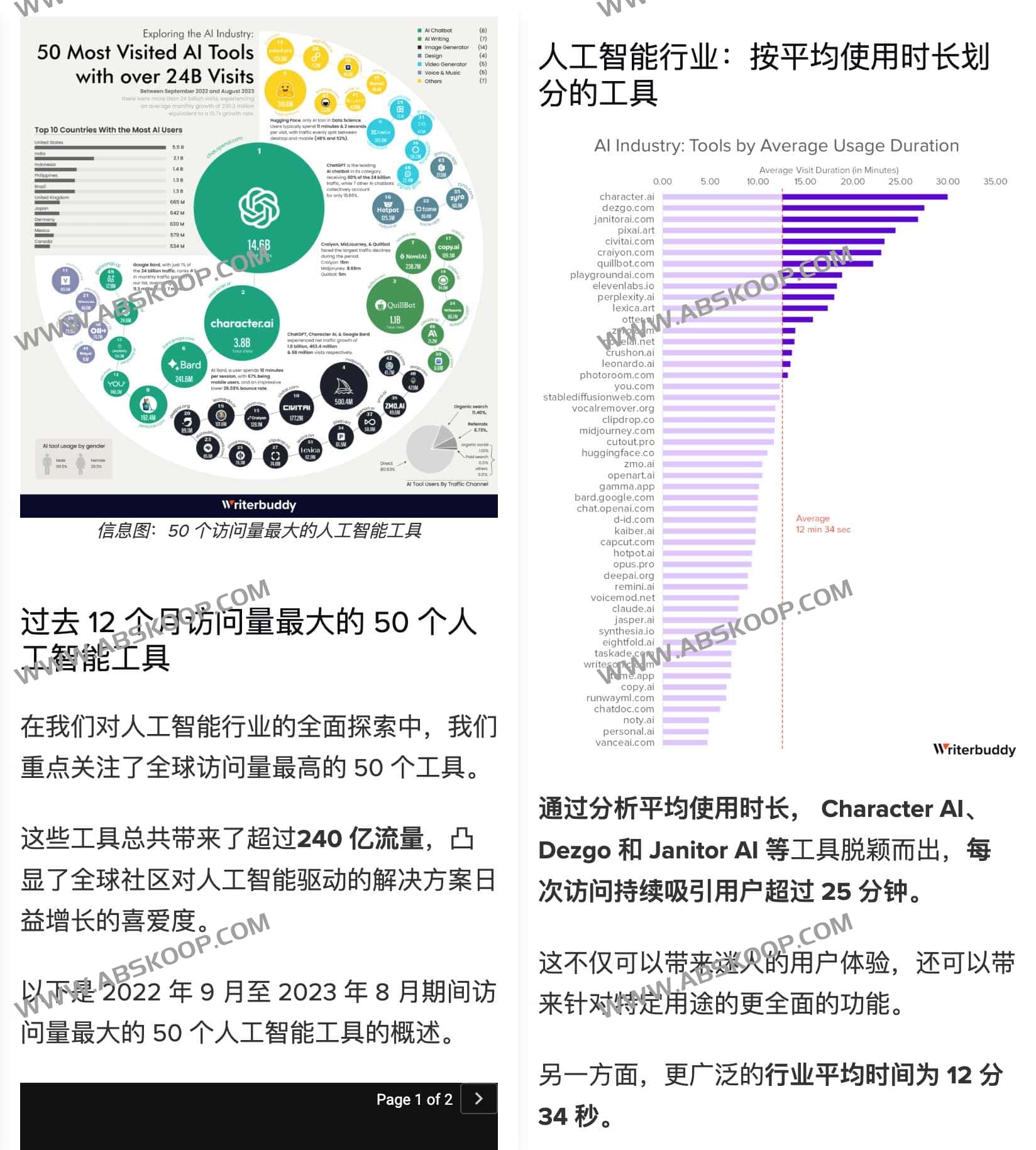 2023年AI行业分析:全球50个访问量最大的AI工具和分析报告:AI Industry Analysis: 50 Most Visited AI Tools and Their 24B+ Traffic Behavior(AI行业分析:50个访问量最大的AI工具及其24B+流量行为),通过利用SEMrush进行AI工具研究的过程,通过从多个目录中抓取数据,研究了3,000多种AI工具,筛选出了访问量最大的50个工具,这些工具代表了在研究期间(2022年9月至2023年8月)人工智能行业80%以上的流量。目标是深入了解人工智能行业的行为,分析流量模式、人口统计、趋势和消费者行为,对AI行业感兴趣的用户可以查看学习一下这份报告。