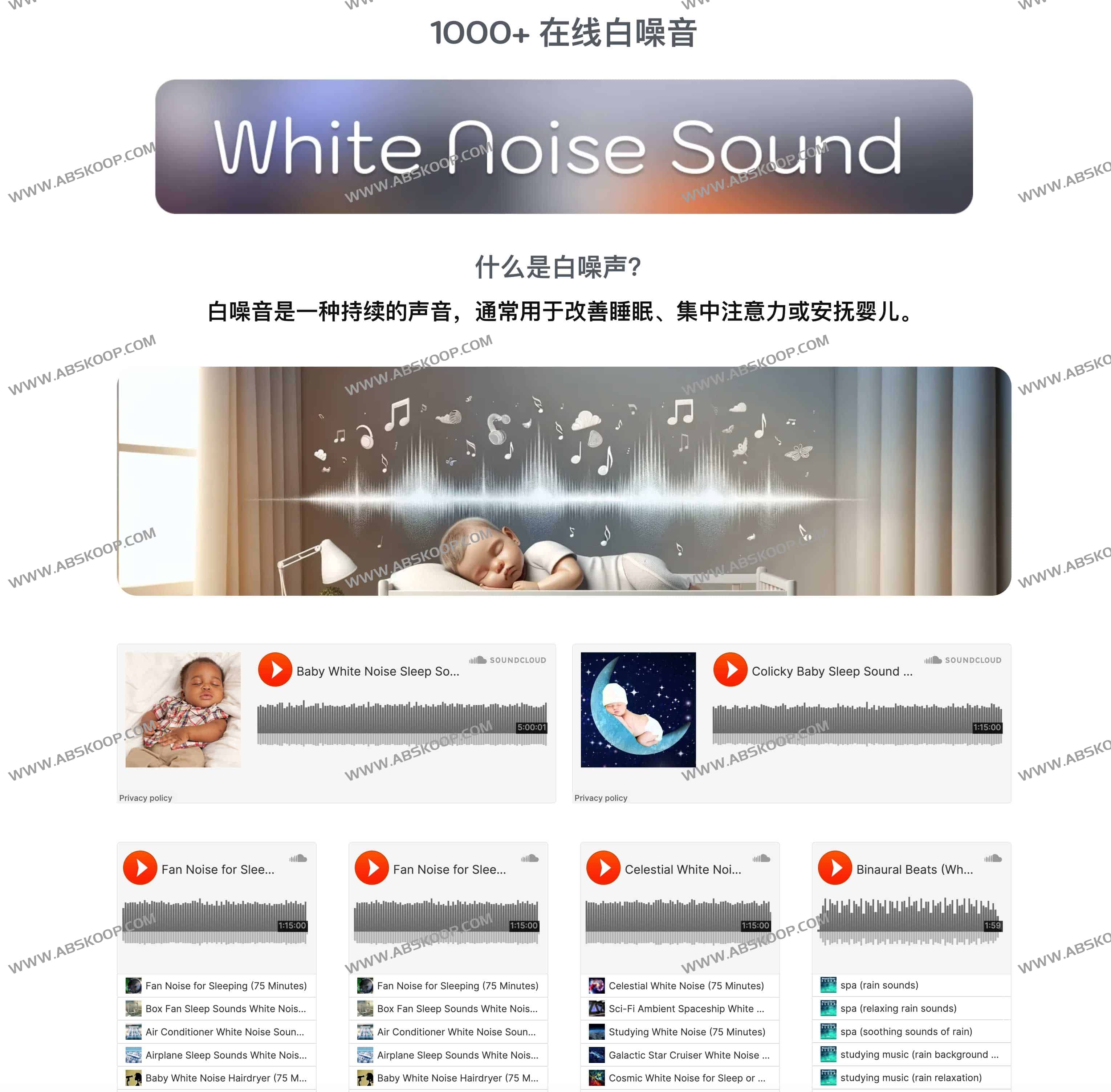 White Noise Sound是一个收集1000+ 在线白噪音的网站,涵盖20+类别白噪音,直接打开浏览器即可在线播放,白噪音是一种持续的声音,通常用于改善睡眠、集中注意力或安抚婴儿,而且网站也非常简约干净。