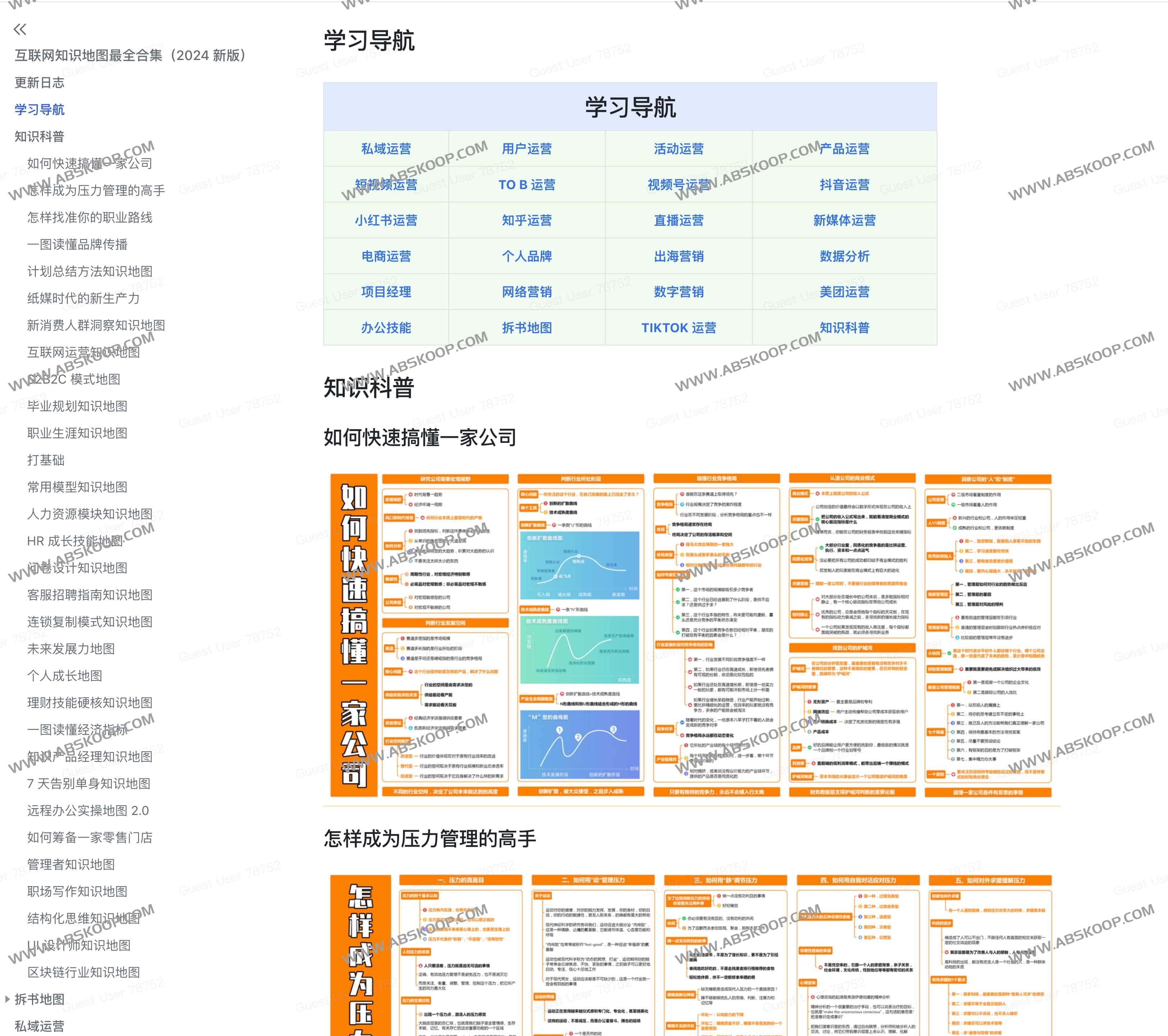 一份在线飞书文档:互联网知识地图最全合集(2024 新版),详细整理了各种互联网的科普知识,包括私域运营、用户运营、产品运营、短视频、小红书、新媒体、直播运营、TikTok运营、出海营销等等,非常全面,而且主打用一张图总结整理,非常干货,对于互联网小白想要踏入互联的用户非常有帮助。