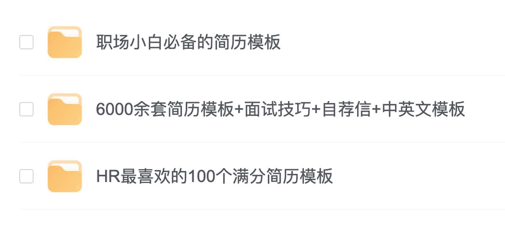 简历模板集合,包括职场小白必备的简历模板、HR最喜欢的100个满分简历模板、6000余套简历模板+面试技巧+自荐信+中英文模板,阿里云盘和夸克网盘资源下载。